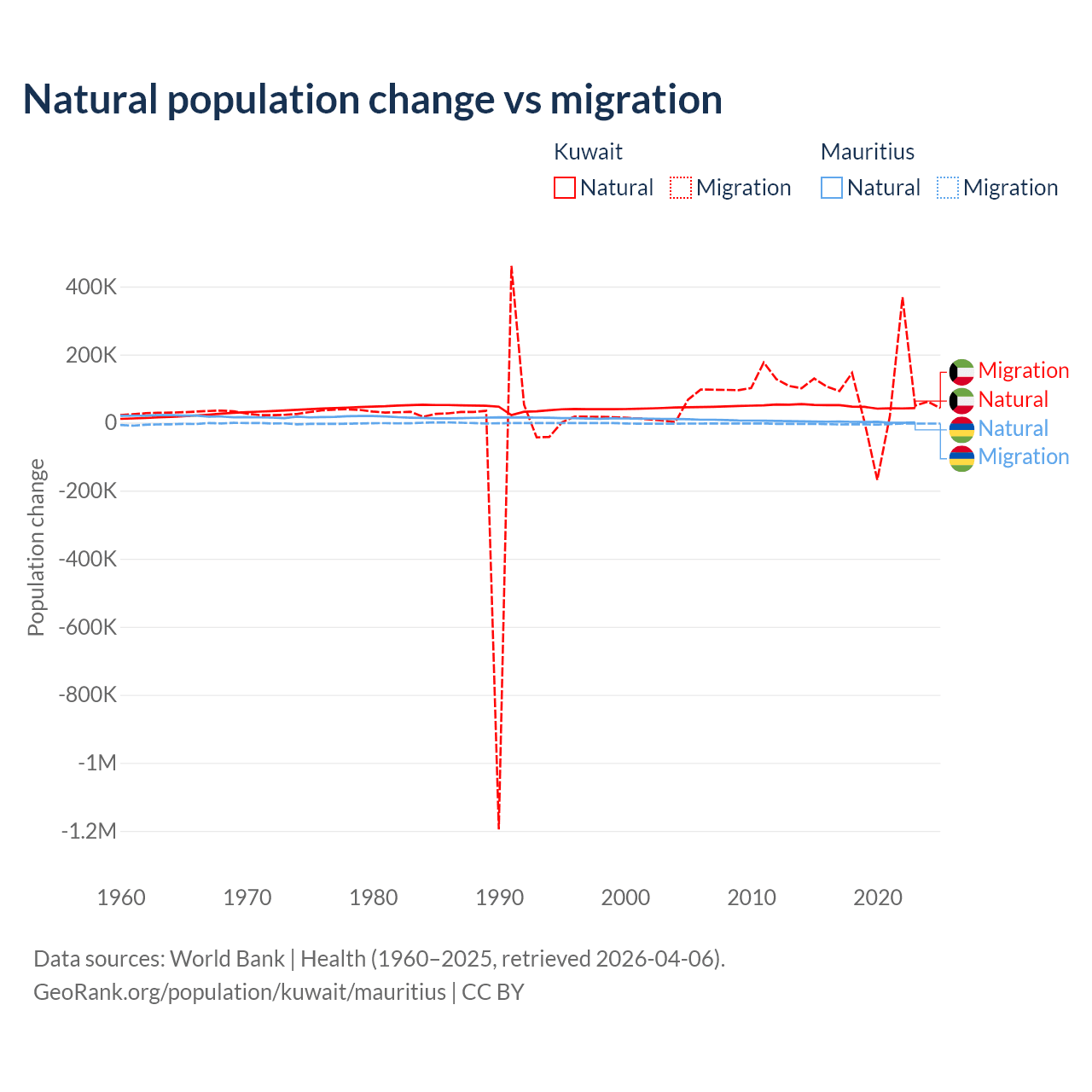 Over the last 10 years, 35.8% of the population change in Kuwait is from natural causes (a gain of 470,645 people) and 64.2% is from migration (a gain of 845,142 people). In Mauritius 30.9% is from natural causes (a gain of 19,327 people) and 69.1% is from migration (a loss of 43,294 people).