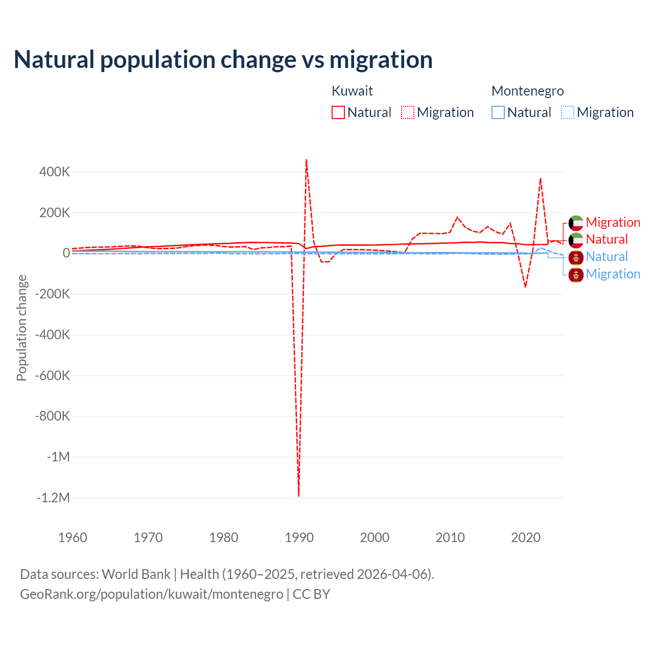 Over the last 10 years, 35.8% of the population change in Kuwait is from natural causes (a gain of 470,645 people) and 64.2% is from migration (a gain of 845,142 people). In Montenegro 52.4% is from natural causes (a gain of 4,501 people) and 47.6% is from migration (a gain of 4,095 people).