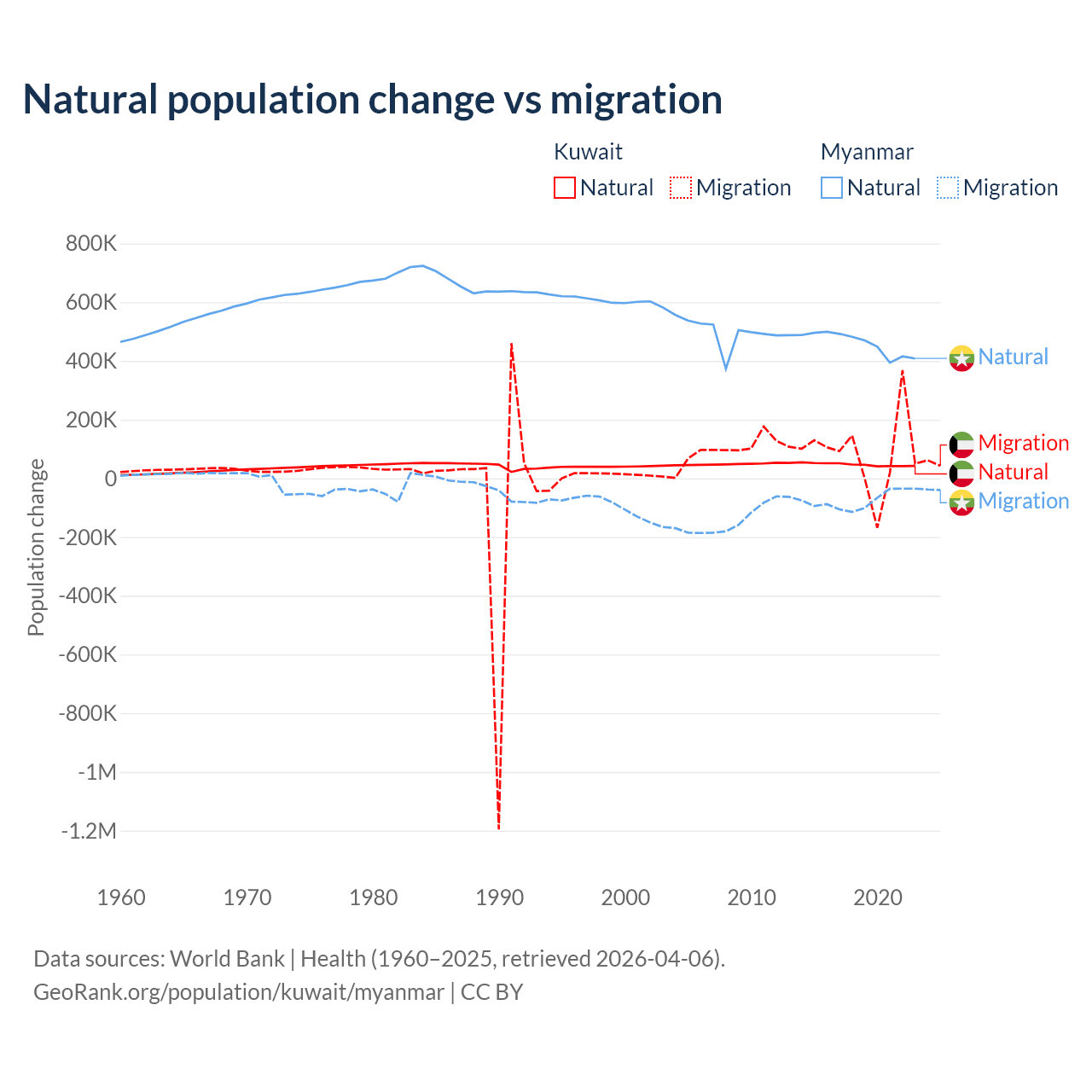 Over the last 10 years, 35.8% of the population change in Kuwait is from natural causes (a gain of 470,645 people) and 64.2% is from migration (a gain of 845,142 people). In Myanmar 86% is from natural causes (a gain of 4,594,615 people) and 14% is from migration (a loss of 749,272 people).