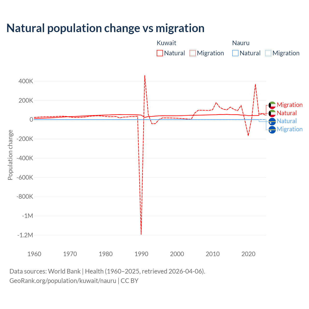 Over the last 10 years, 35.8% of the population change in Kuwait is from natural causes (a gain of 470,645 people) and 64.2% is from migration (a gain of 845,142 people). In Nauru 66.2% is from natural causes (a gain of 2,590 people) and 33.8% is from migration (a loss of 1,320 people).