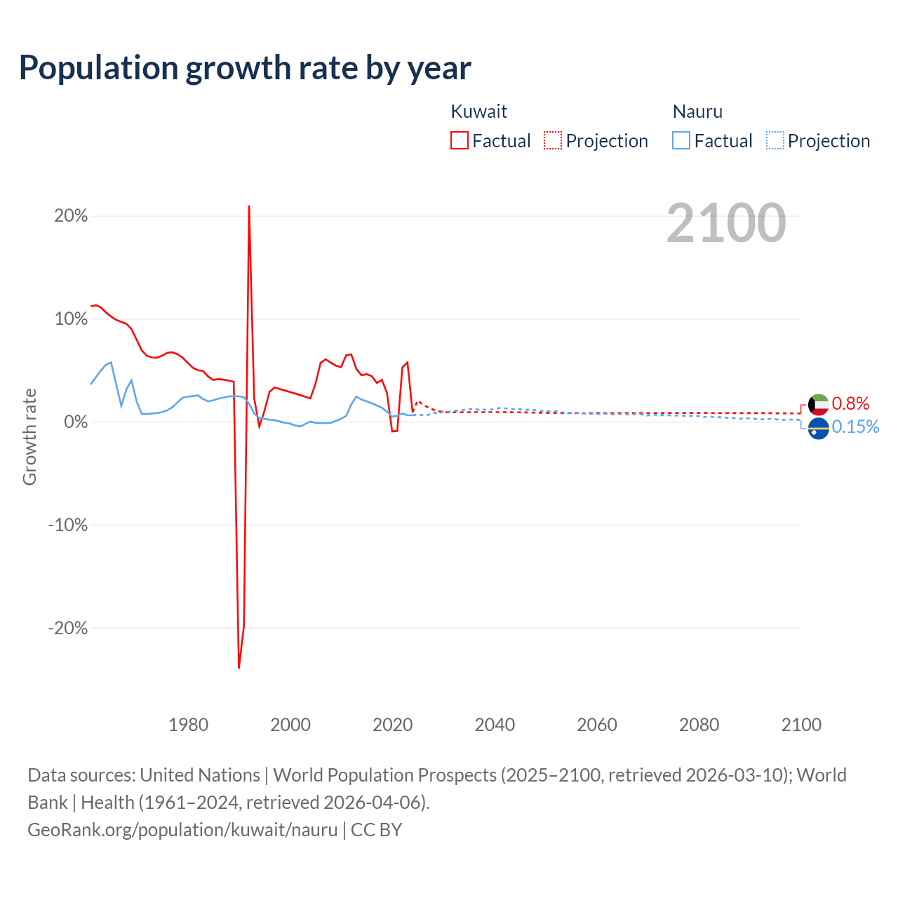 - For the last 10 years, Kuwait has had an average growth rate of +3.1% per year vs +1.17% in Nauru.