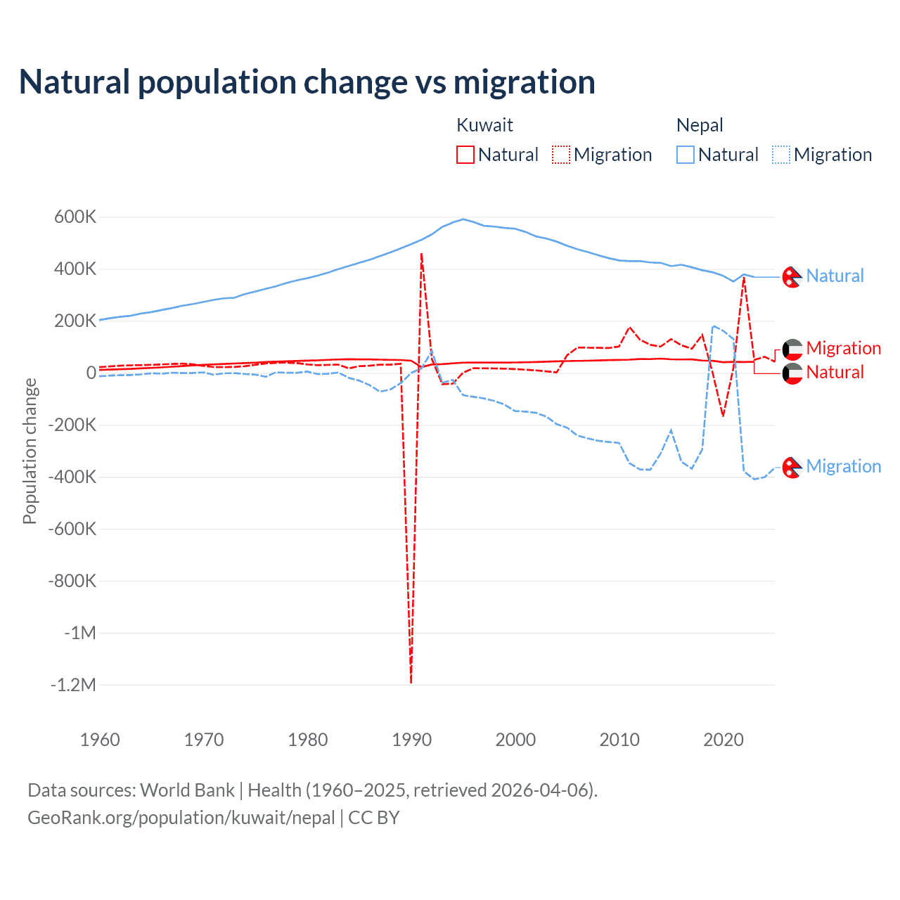 Over the last 10 years, 35.8% of the population change in Kuwait is from natural causes (a gain of 470,645 people) and 64.2% is from migration (a gain of 845,142 people). In Nepal 67.9% is from natural causes (a gain of 3,909,749 people) and 32.1% is from migration (a loss of 1,851,664 people).