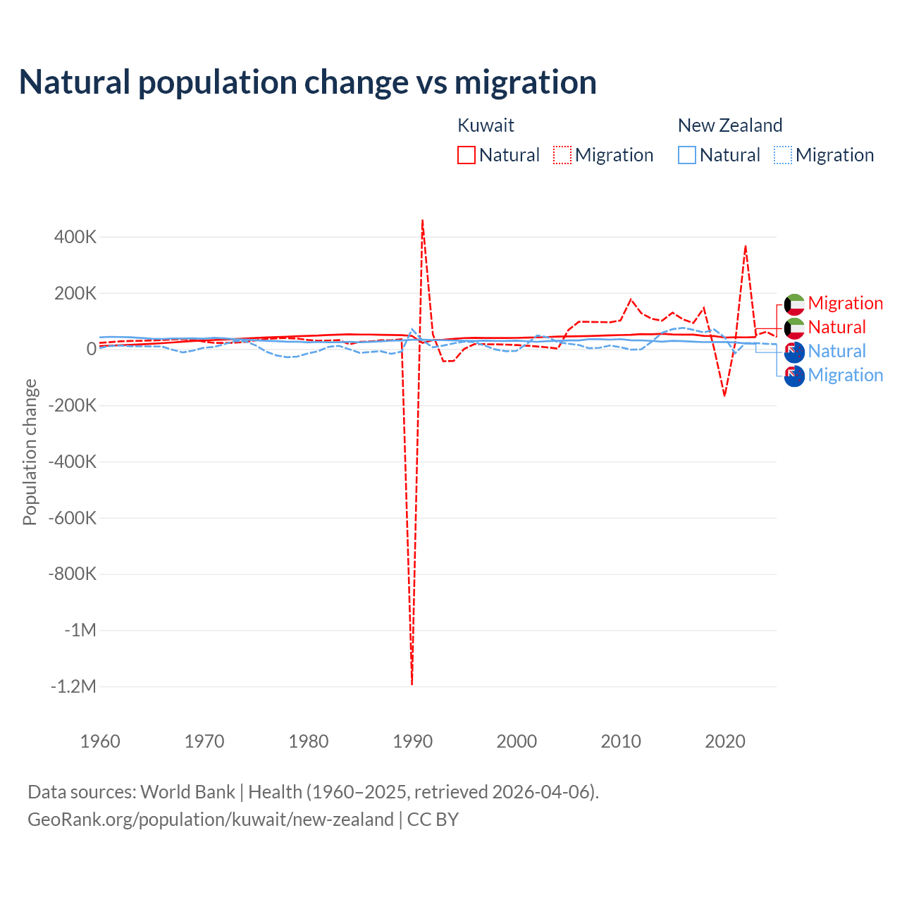 Over the last 10 years, 35.8% of the population change in Kuwait is from natural causes (a gain of 470,645 people) and 64.2% is from migration (a gain of 845,142 people). In New Zealand 34.4% is from natural causes (a gain of 247,767 people) and 65.6% is from migration (a gain of 471,602 people).