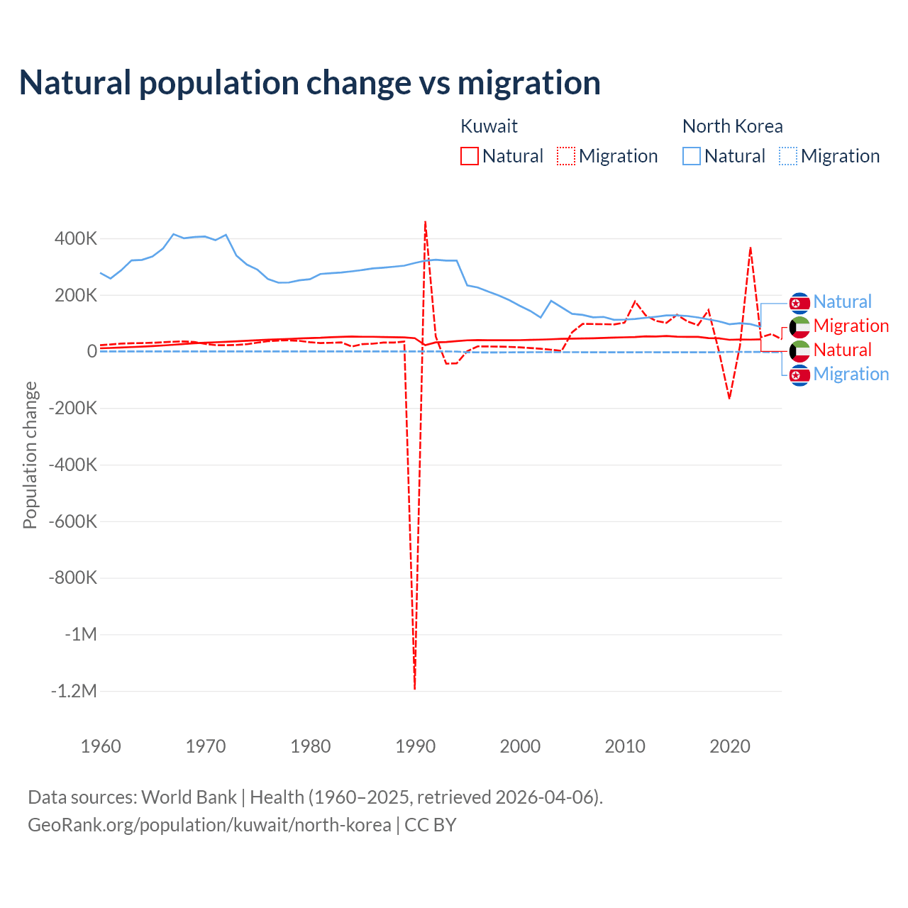 Over the last 10 years, 35.8% of the population change in Kuwait is from natural causes (a gain of 470,645 people) and 64.2% is from migration (a gain of 845,142 people). In North Korea 97.7% is from natural causes (a gain of 1,097,372 people) and 2.33% is from migration (a loss of 26,227 people).
