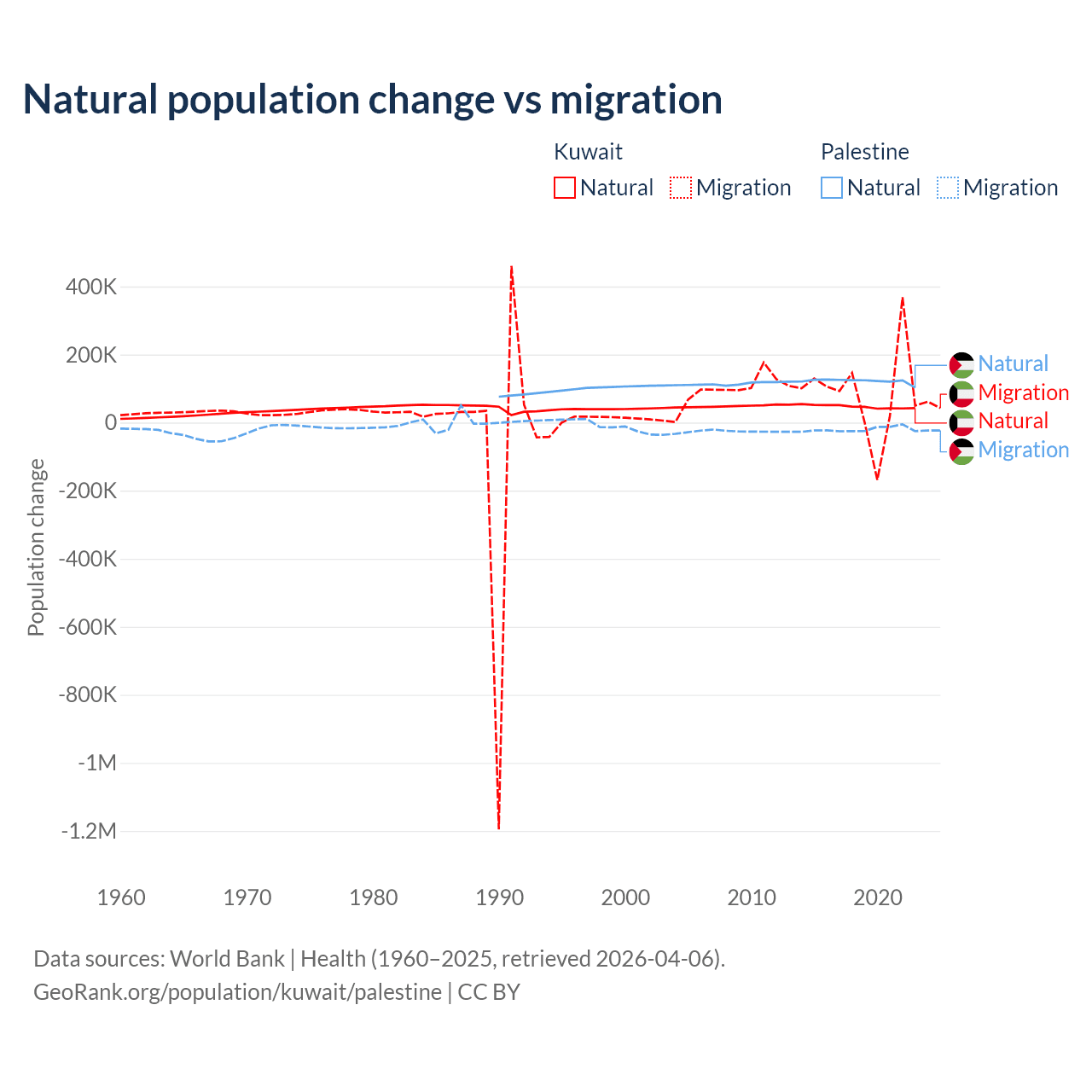Over the last 10 years, 35.8% of the population change in Kuwait is from natural causes (a gain of 470,645 people) and 64.2% is from migration (a gain of 845,142 people). In Palestine 85.7% is from natural causes (a gain of 1,218,010 people) and 14.3% is from migration (a loss of 202,820 people).