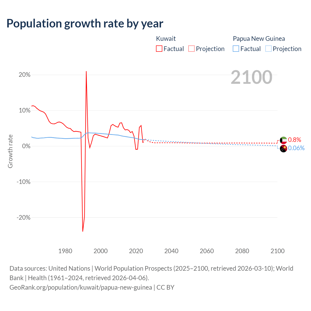 - For the last 10 years, Kuwait has had an average growth rate of +3.1% per year vs +2.23% in Papua New Guinea.