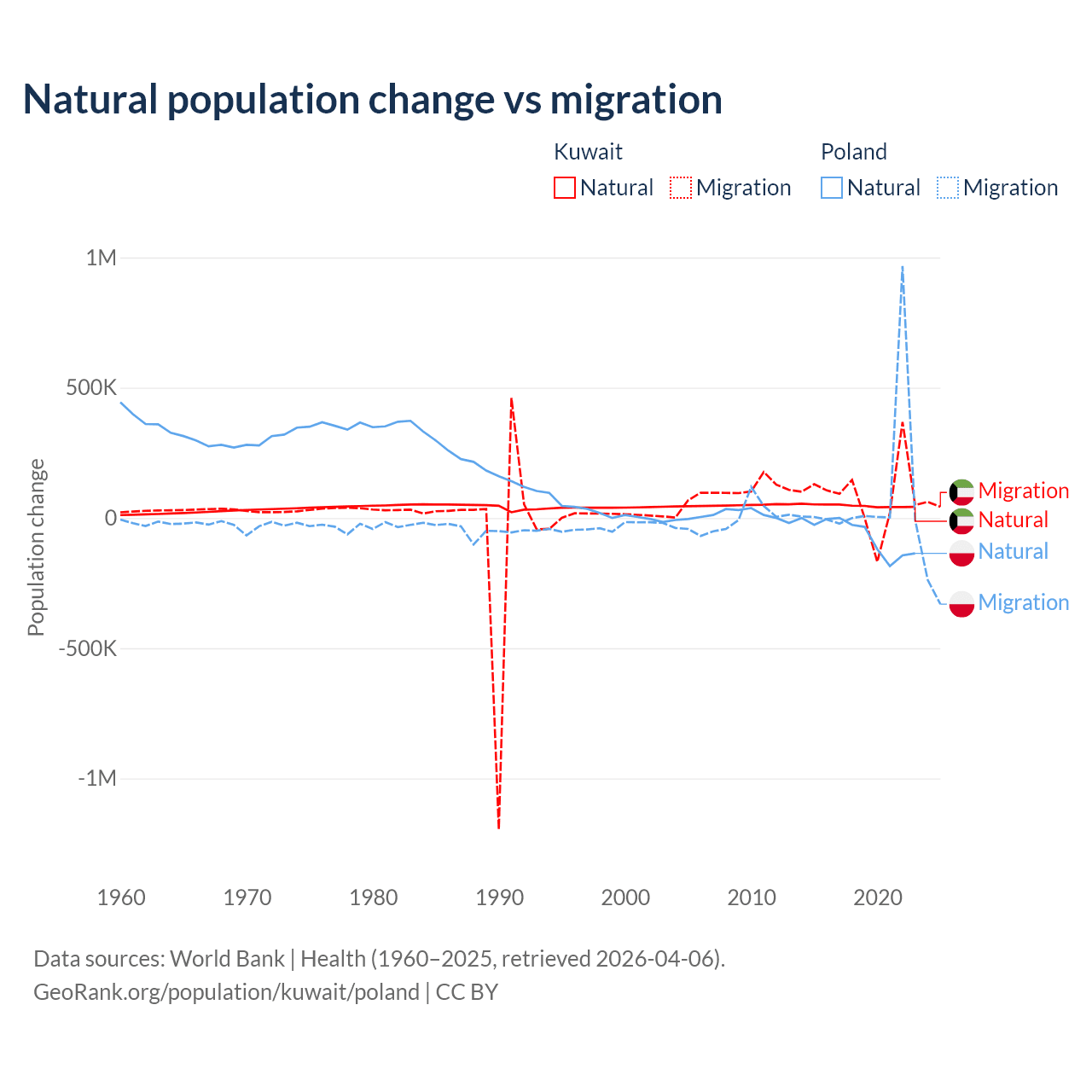 Over the last 10 years, 35.8% of the population change in Kuwait is from natural causes (a gain of 470,645 people) and 64.2% is from migration (a gain of 845,142 people). In Poland 41.4% is from natural causes (a loss of 675,443 people) and 58.6% is from migration (a gain of 955,766 people).