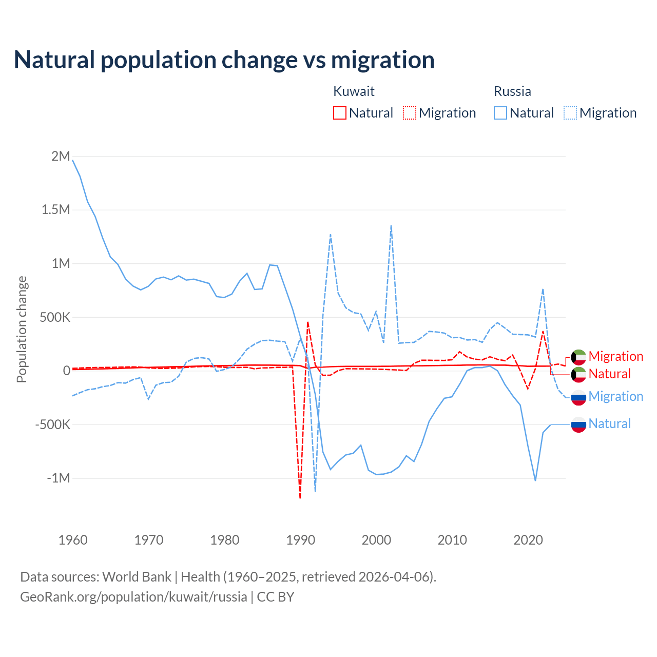 Over the last 10 years, 35.8% of the population change in Kuwait is from natural causes (a gain of 470,645 people) and 64.2% is from migration (a gain of 845,142 people). In Russia 48.6% is from natural causes (a loss of 3,416,377 people) and 51.4% is from migration (a gain of 3,611,826 people).