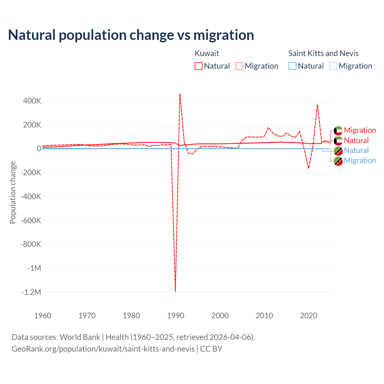 Over the last 10 years, 35.8% of the population change in Kuwait is from natural causes (a gain of 470,645 people) and 64.2% is from migration (a gain of 845,142 people). In Saint Kitts and Nevis 44.9% is from natural causes (a gain of 1,225 people) and 55.1% is from migration (a loss of 1,506 people).