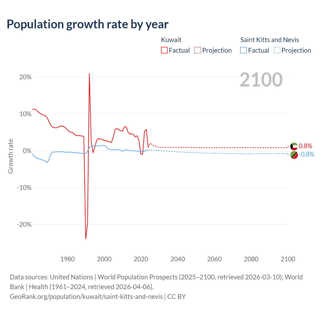 - For the last 10 years, Kuwait has had an average growth rate of +3.1% per year vs -0.04% in Saint Kitts and Nevis.