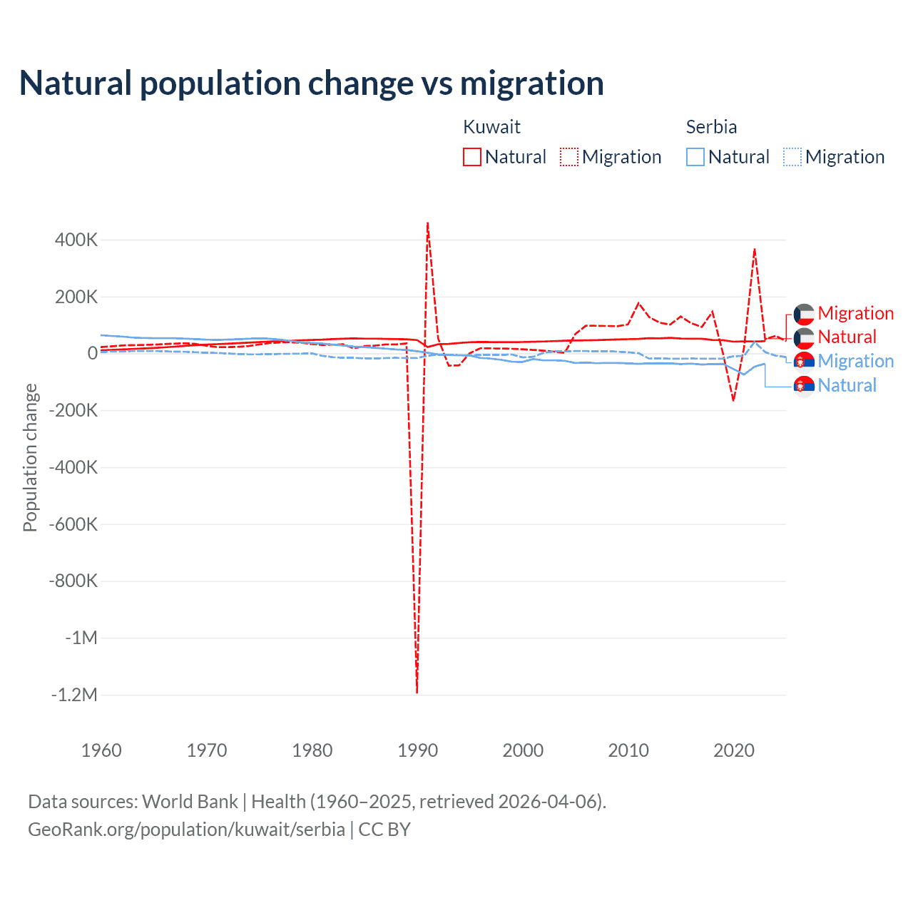 Over the last 10 years, 35.8% of the population change in Kuwait is from natural causes (a gain of 470,645 people) and 64.2% is from migration (a gain of 845,142 people). In Serbia 83.3% is from natural causes (a loss of 435,148 people) and 16.7% is from migration (a loss of 87,110 people).