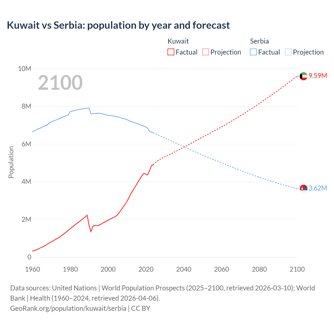 The latest officially reported population of Kuwait was 4,897,263 in 2024 vs 6,586,476 people in Serbia in 2024. In 2026, based on the adjusted UN estimation, the current Kuwait's population is 5,100,145 people compared to 6,494,521 in Serbia.