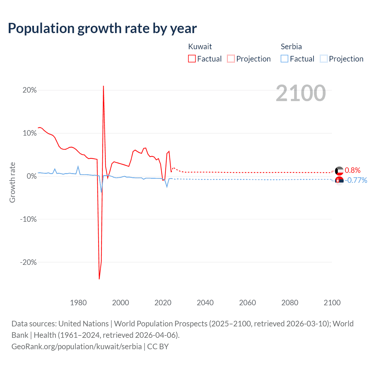 - For the last 10 years, Kuwait has had an average growth rate of +3.1% per year vs -0.76% in Serbia.