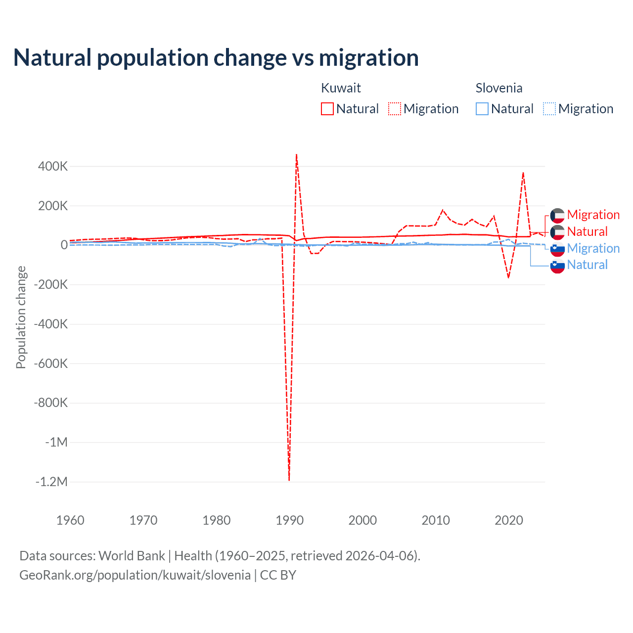 Over the last 10 years, 35.8% of the population change in Kuwait is from natural causes (a gain of 470,645 people) and 64.2% is from migration (a gain of 845,142 people). In Slovenia 18.1% is from natural causes (a loss of 17,573 people) and 81.9% is from migration (a gain of 79,532 people).
