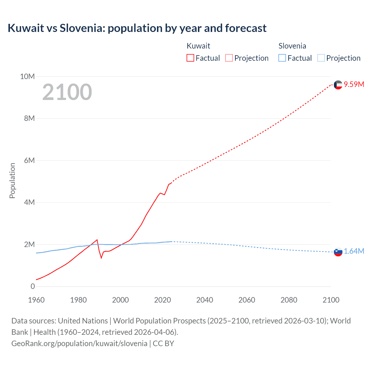 The latest officially reported population of Kuwait was 4,897,263 in 2024 vs 2,127,400 people in Slovenia in 2024. In 2026, based on the adjusted UN estimation, the current Kuwait's population is 5,100,145 people compared to 2,124,138 in Slovenia.