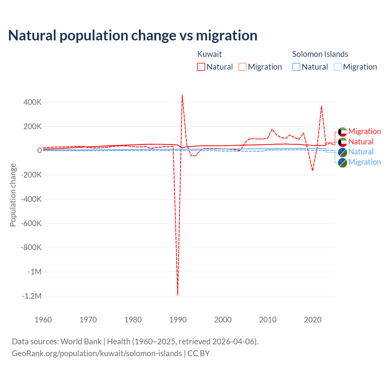 Over the last 10 years, 35.8% of the population change in Kuwait is from natural causes (a gain of 470,645 people) and 64.2% is from migration (a gain of 845,142 people). In the Solomon Islands 82.8% is from natural causes (a gain of 168,727 people) and 17.2% is from migration (a gain of 35,031 people).