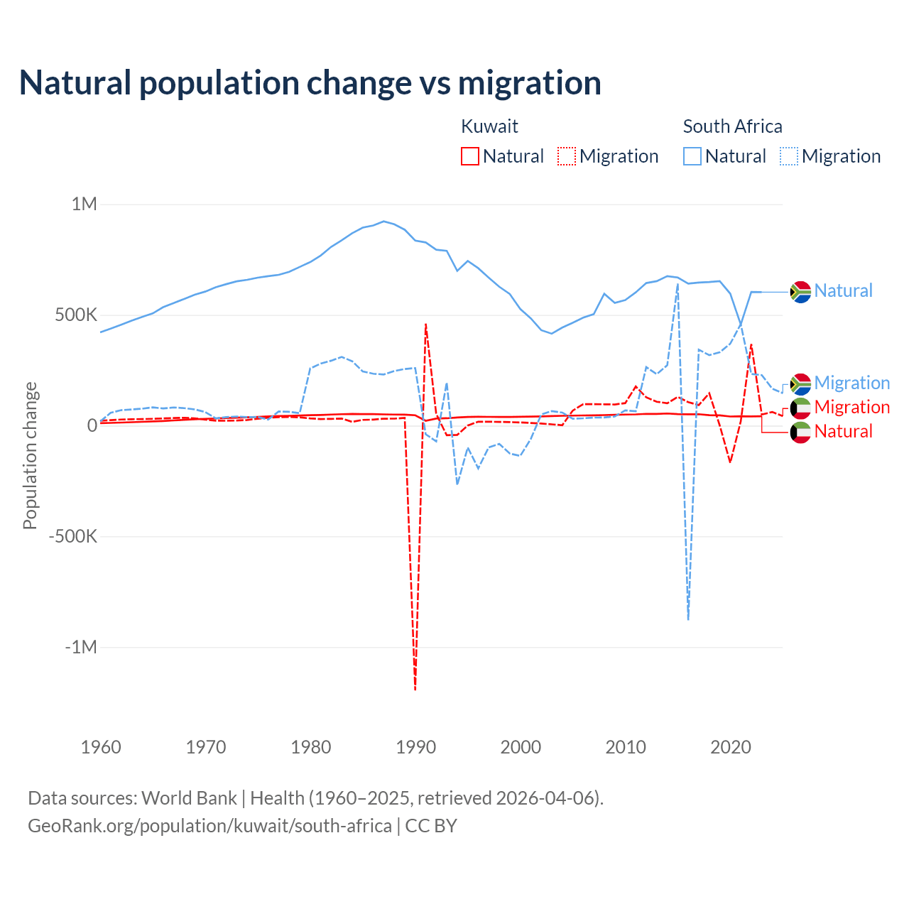 Over the last 10 years, 35.8% of the population change in Kuwait is from natural causes (a gain of 470,645 people) and 64.2% is from migration (a gain of 845,142 people). In South Africa 72.8% is from natural causes (a gain of 6,190,027 people) and 27.2% is from migration (a gain of 2,316,795 people).
