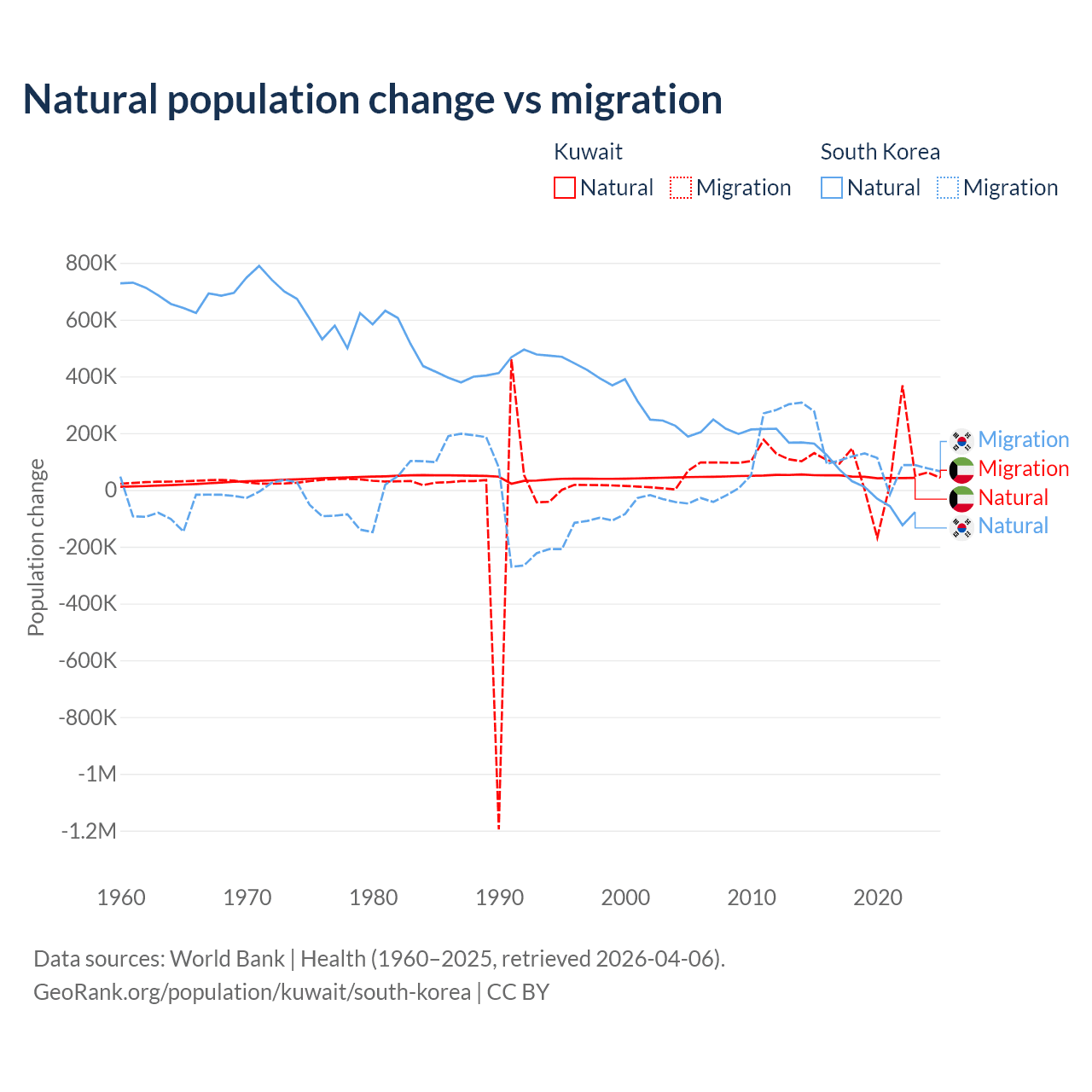 Over the last 10 years, 35.8% of the population change in Kuwait is from natural causes (a gain of 470,645 people) and 64.2% is from migration (a gain of 845,142 people). In South Korea 17.6% is from natural causes (a gain of 277,215 people) and 82.4% is from migration (a gain of 1,298,356 people).