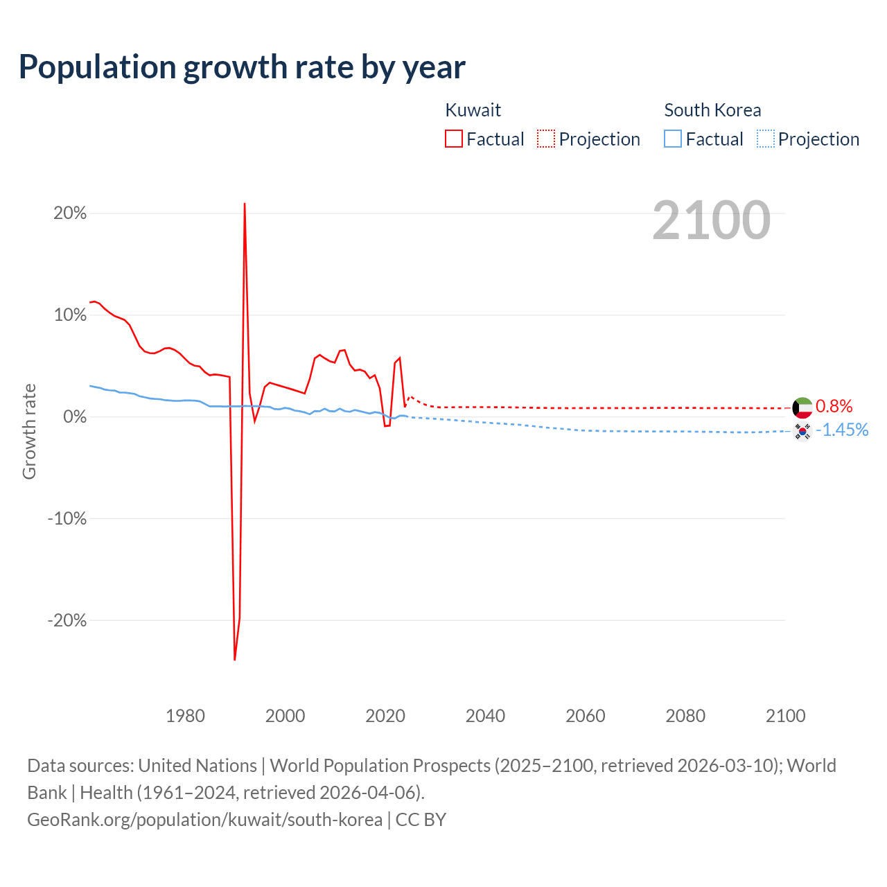 - For the last 10 years, Kuwait has had an average growth rate of +3.1% per year vs +0.24% in South Korea.
