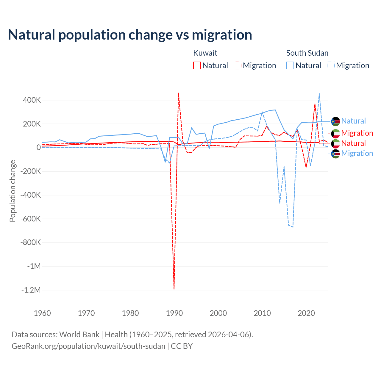 Over the last 10 years, 35.8% of the population change in Kuwait is from natural causes (a gain of 470,645 people) and 64.2% is from migration (a gain of 845,142 people). In South Sudan 57.4% is from natural causes (a gain of 1,792,135 people) and 42.6% is from migration (a loss of 1,329,606 people).