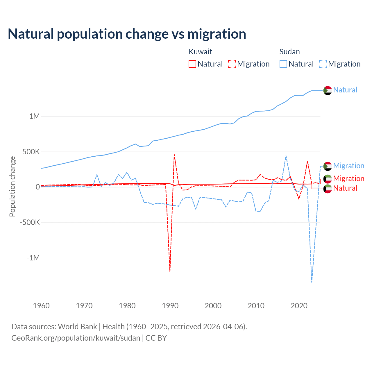 Over the last 10 years, 35.8% of the population change in Kuwait is from natural causes (a gain of 470,645 people) and 64.2% is from migration (a gain of 845,142 people). In Sudan 95.1% is from natural causes (a gain of 12,459,977 people) and 4.88% is from migration (a loss of 639,596 people).