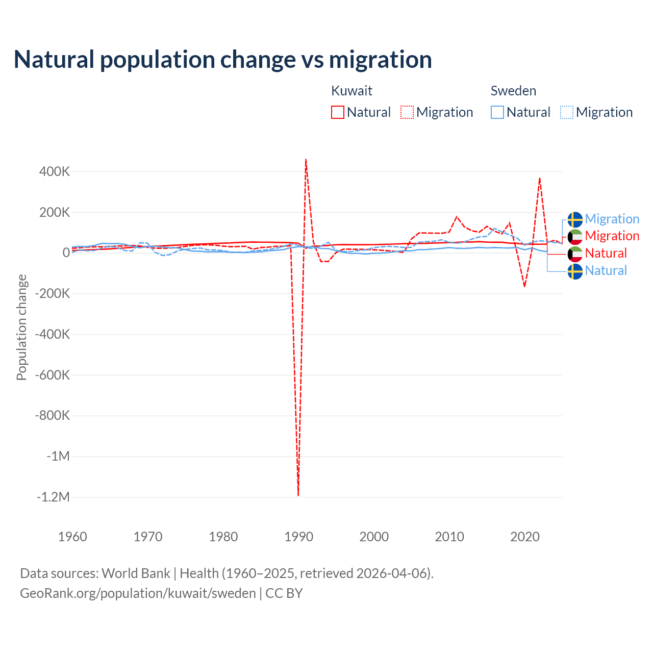 Over the last 10 years, 35.8% of the population change in Kuwait is from natural causes (a gain of 470,645 people) and 64.2% is from migration (a gain of 845,142 people). In Sweden 21.4% is from natural causes (a gain of 201,900 people) and 78.6% is from migration (a gain of 743,642 people).