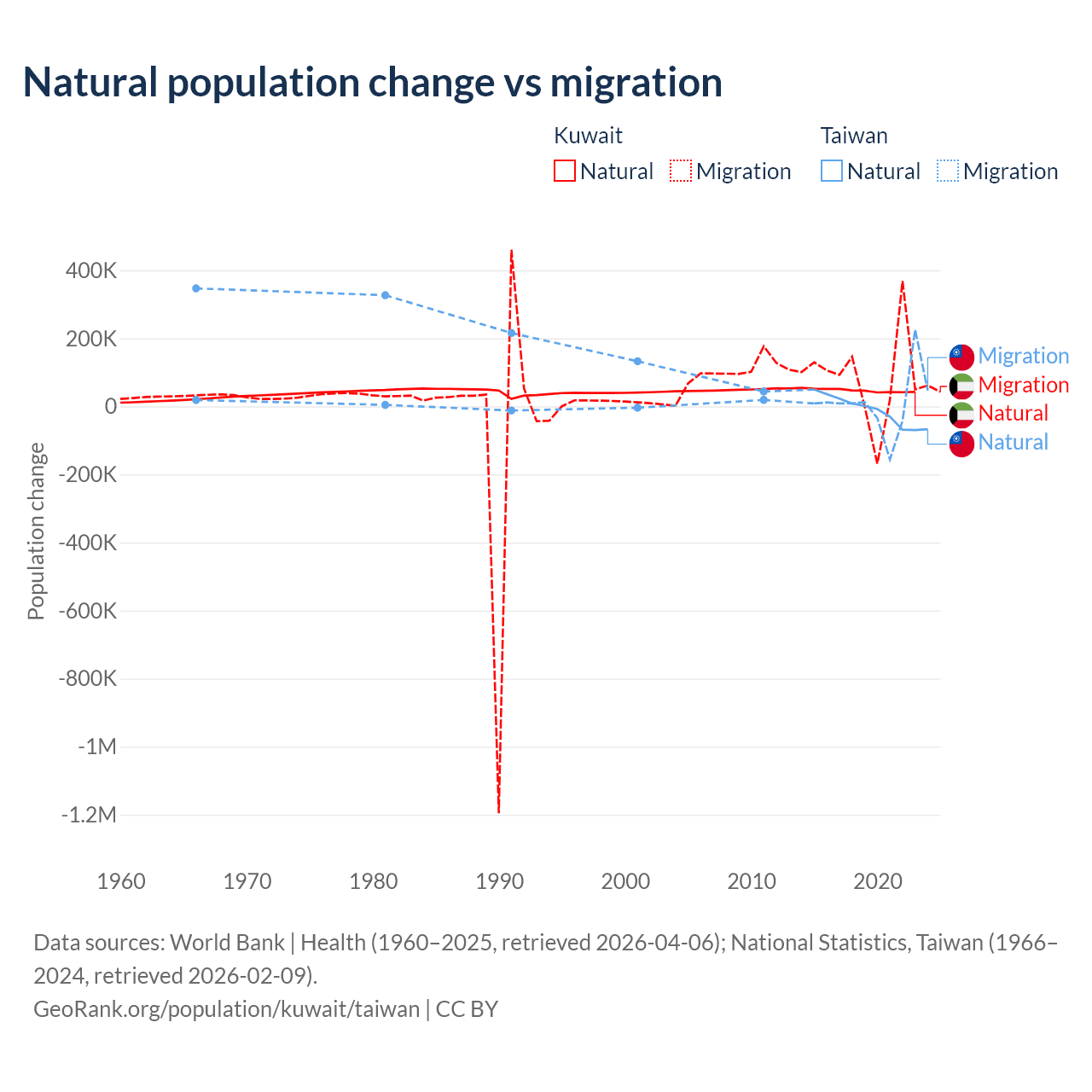 Over the last 10 years, 35.8% of the population change in Kuwait is from natural causes (a gain of 470,645 people) and 64.2% is from migration (a gain of 845,142 people). In Taiwan 56.7% is from natural causes (a loss of 57,467 people) and 43.3% is from migration (a gain of 43,884 people).