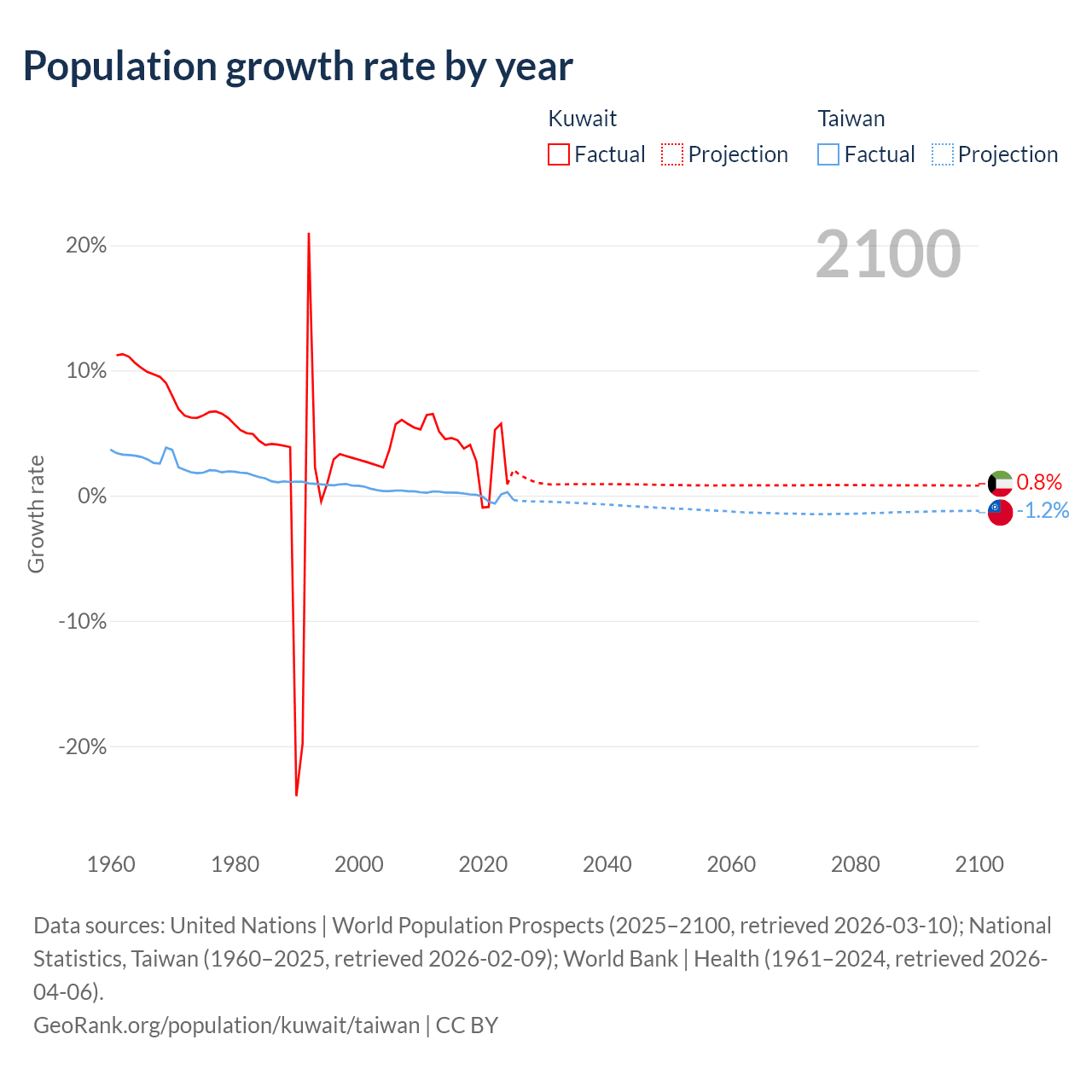 - For the last 10 years, Kuwait has had an average growth rate of +3.1% per year vs -0.03% in Taiwan.
