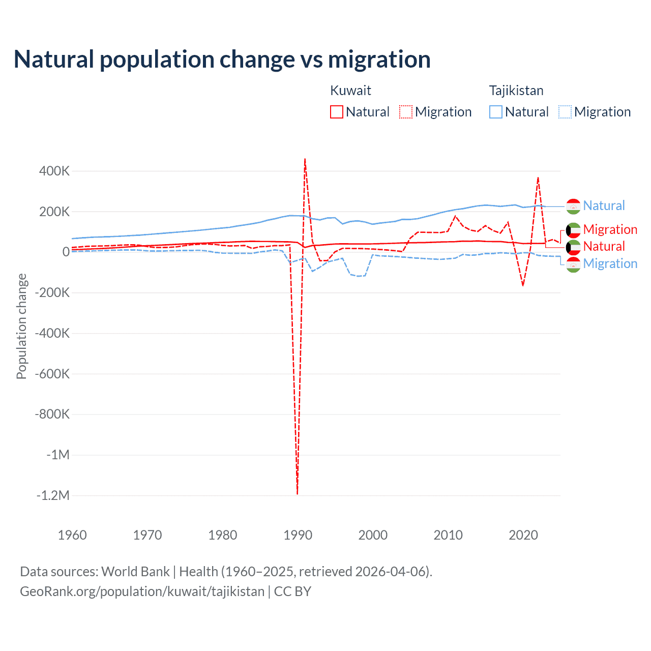 Over the last 10 years, 35.8% of the population change in Kuwait is from natural causes (a gain of 470,645 people) and 64.2% is from migration (a gain of 845,142 people). In Tajikistan 96% is from natural causes (a gain of 2,266,045 people) and 3.95% is from migration (a loss of 93,205 people).