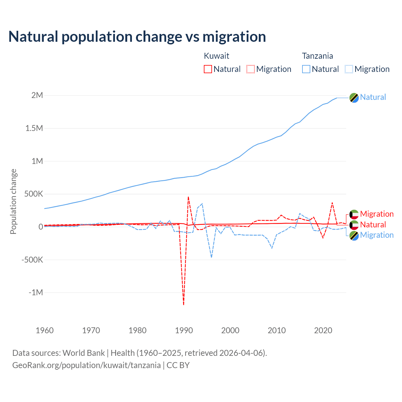 Over the last 10 years, 35.8% of the population change in Kuwait is from natural causes (a gain of 470,645 people) and 64.2% is from migration (a gain of 845,142 people). In Tanzania 98.7% is from natural causes (a gain of 17,769,541 people) and 1.27% is from migration (a gain of 229,466 people).