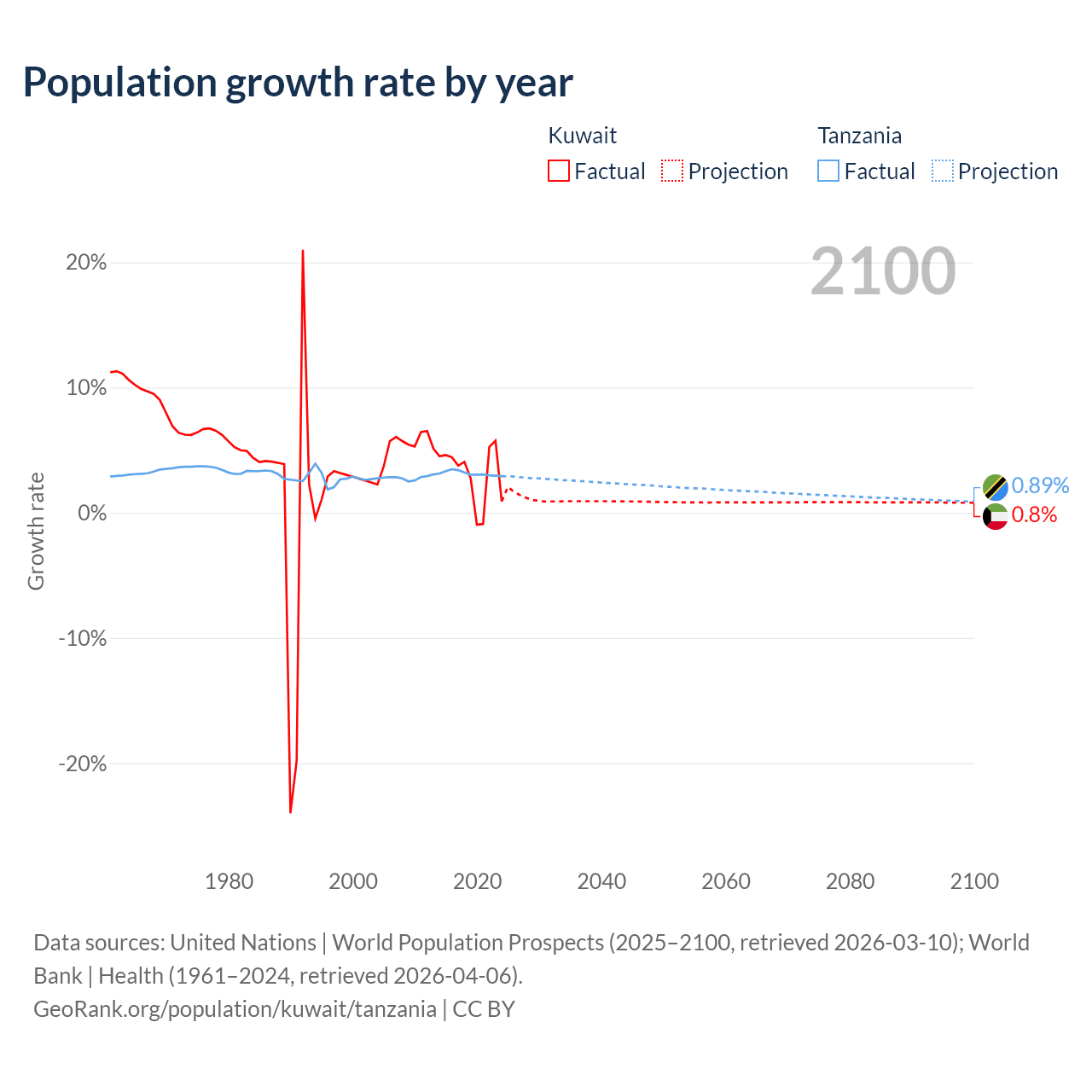 - For the last 10 years, Kuwait has had an average growth rate of +3.1% per year vs +3.13% in Tanzania.