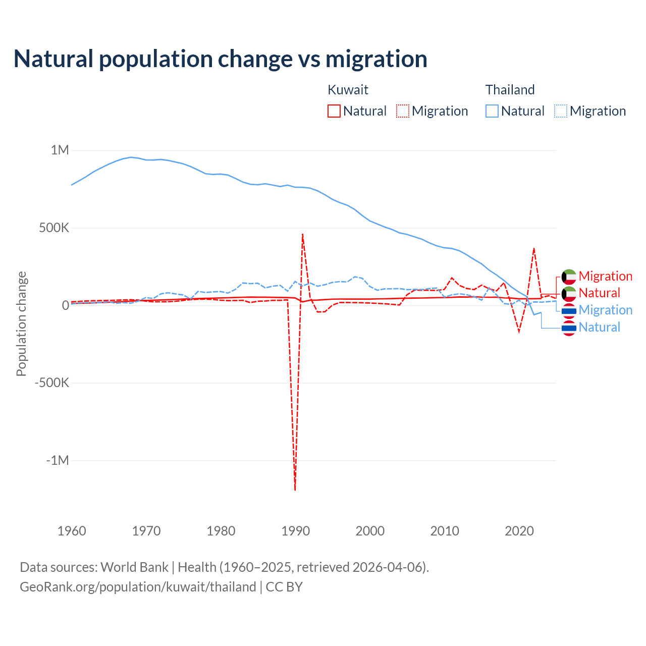 Over the last 10 years, 35.8% of the population change in Kuwait is from natural causes (a gain of 470,645 people) and 64.2% is from migration (a gain of 845,142 people). In Thailand 78.4% is from natural causes (a gain of 1,292,528 people) and 21.6% is from migration (a gain of 355,361 people).