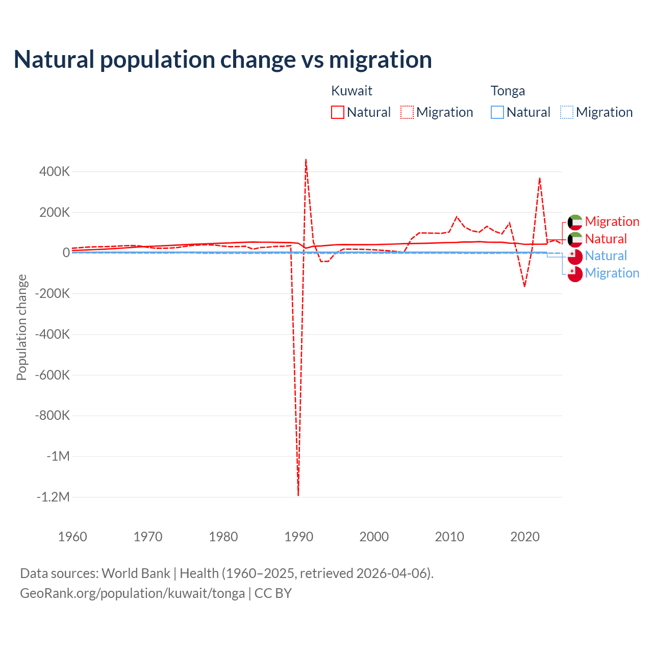 Over the last 10 years, 35.8% of the population change in Kuwait is from natural causes (a gain of 470,645 people) and 64.2% is from migration (a gain of 845,142 people). In Tonga 46.9% is from natural causes (a gain of 18,919 people) and 53.1% is from migration (a loss of 21,384 people).