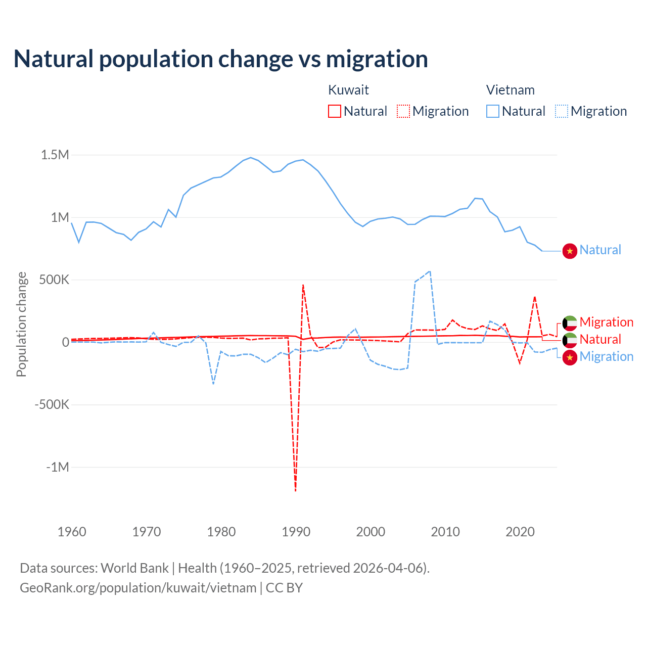 Over the last 10 years, 35.8% of the population change in Kuwait is from natural causes (a gain of 470,645 people) and 64.2% is from migration (a gain of 845,142 people). In Vietnam 97.7% is from natural causes (a gain of 9,349,756 people) and 2.29% is from migration (a gain of 219,073 people).