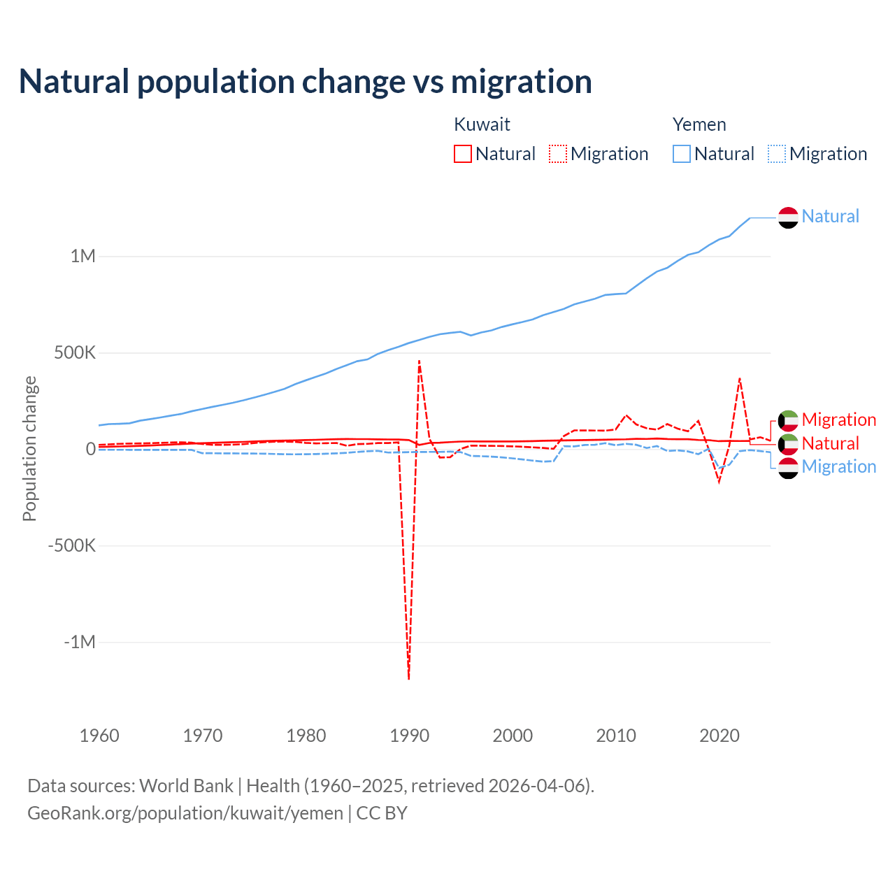 Over the last 10 years, 35.8% of the population change in Kuwait is from natural causes (a gain of 470,645 people) and 64.2% is from migration (a gain of 845,142 people). In Yemen 97.8% is from natural causes (a gain of 10,460,813 people) and 2.17% is from migration (a loss of 231,814 people).
