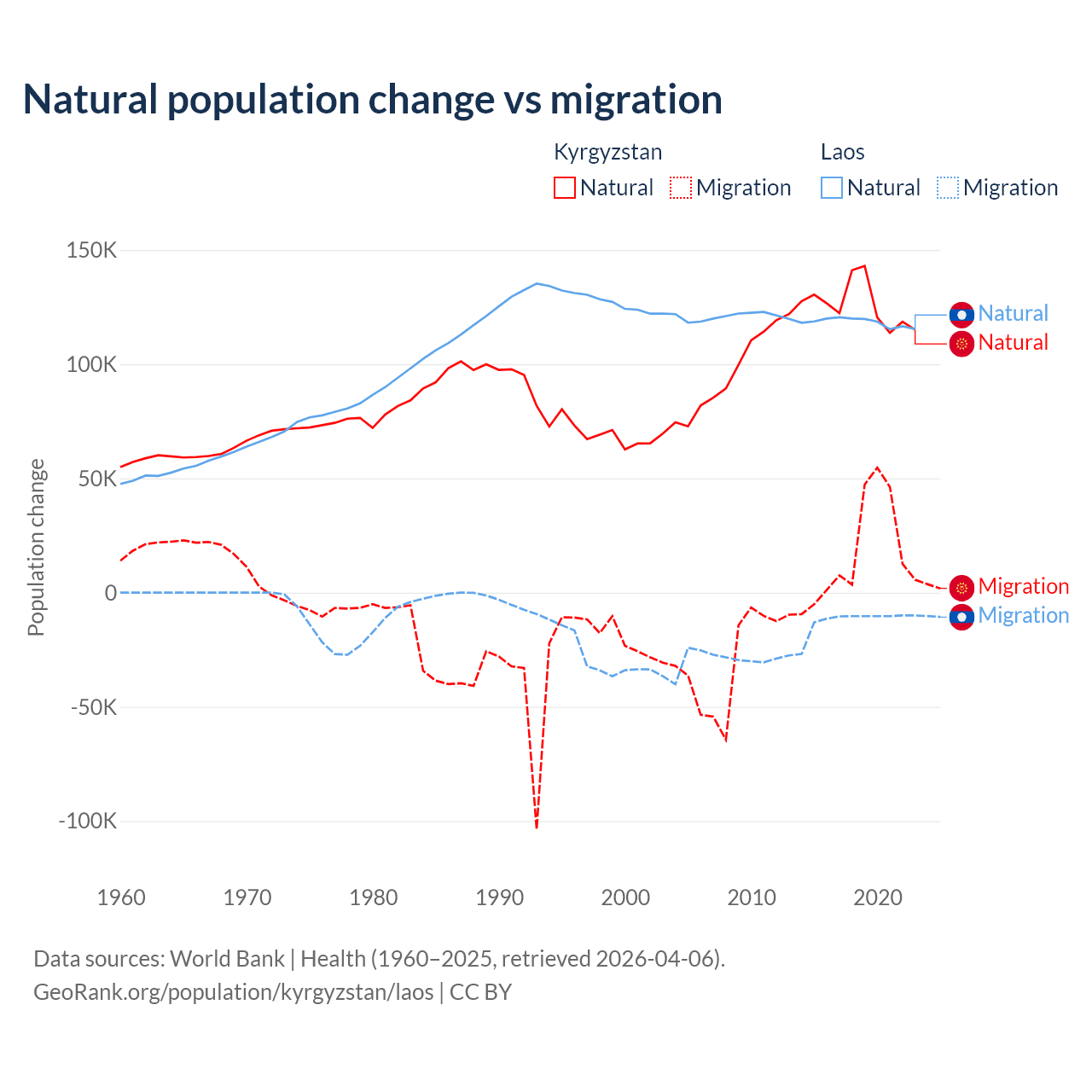 Over the last 10 years, 88.5% of the population change in Kyrgyzstan is from natural causes (a gain of 1,258,837 people) and 11.5% is from migration (a gain of 164,132 people). In Laos 90.6% is from natural causes (a gain of 1,183,013 people) and 9.41% is from migration (a loss of 122,899 people).
