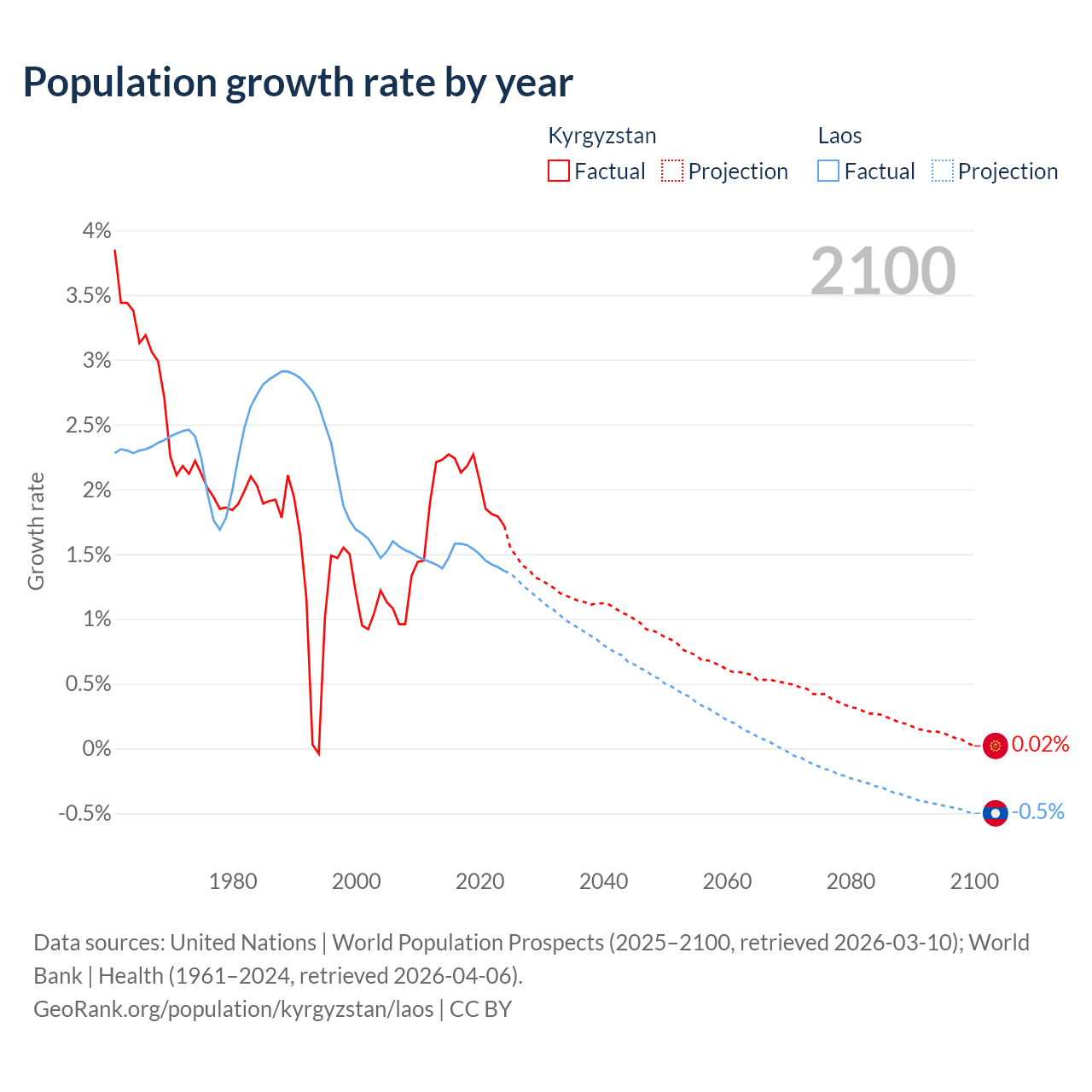 - For the last 10 years, Kyrgyzstan has had an average growth rate of +2.05% per year vs +1.48% in Laos.