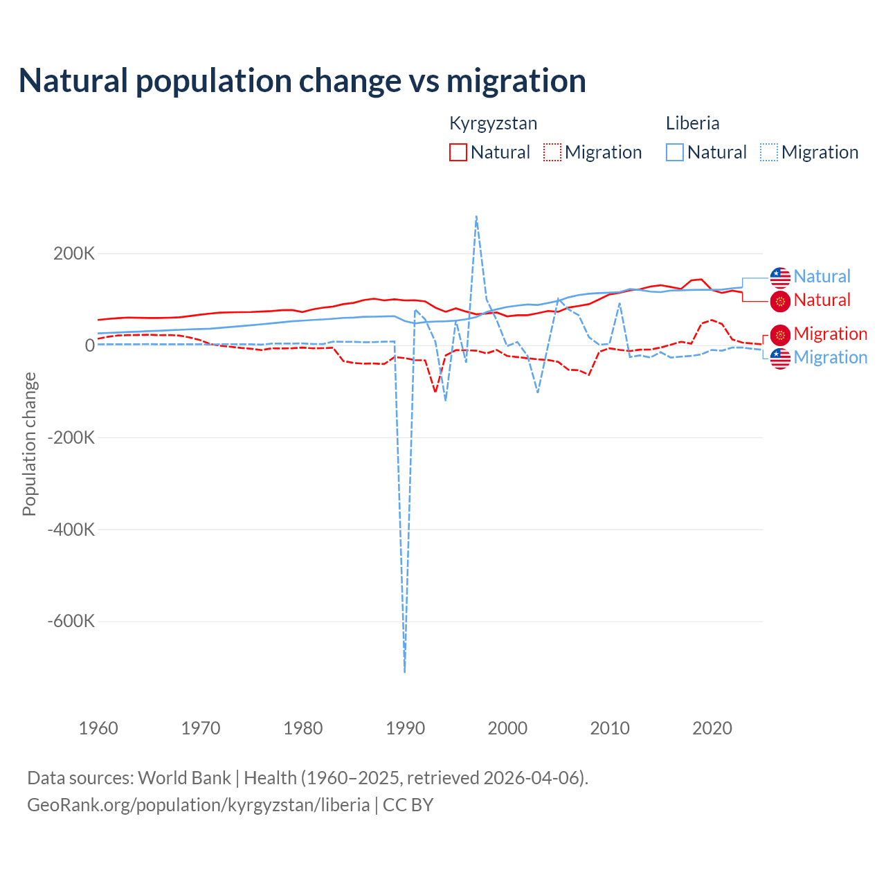Over the last 10 years, 88.5% of the population change in Kyrgyzstan is from natural causes (a gain of 1,258,837 people) and 11.5% is from migration (a gain of 164,132 people). In Liberia 87.7% is from natural causes (a gain of 1,202,387 people) and 12.3% is from migration (a loss of 168,316 people).