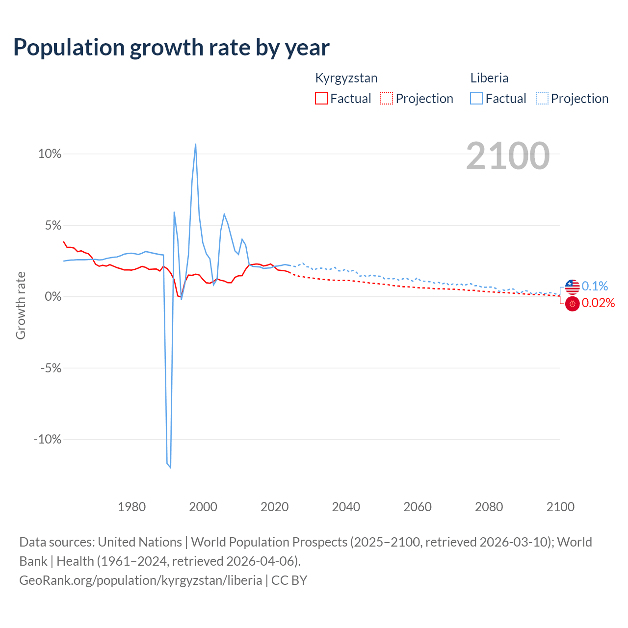 - For the last 10 years, Kyrgyzstan has had an average growth rate of +2.05% per year vs +2.09% in Liberia.
