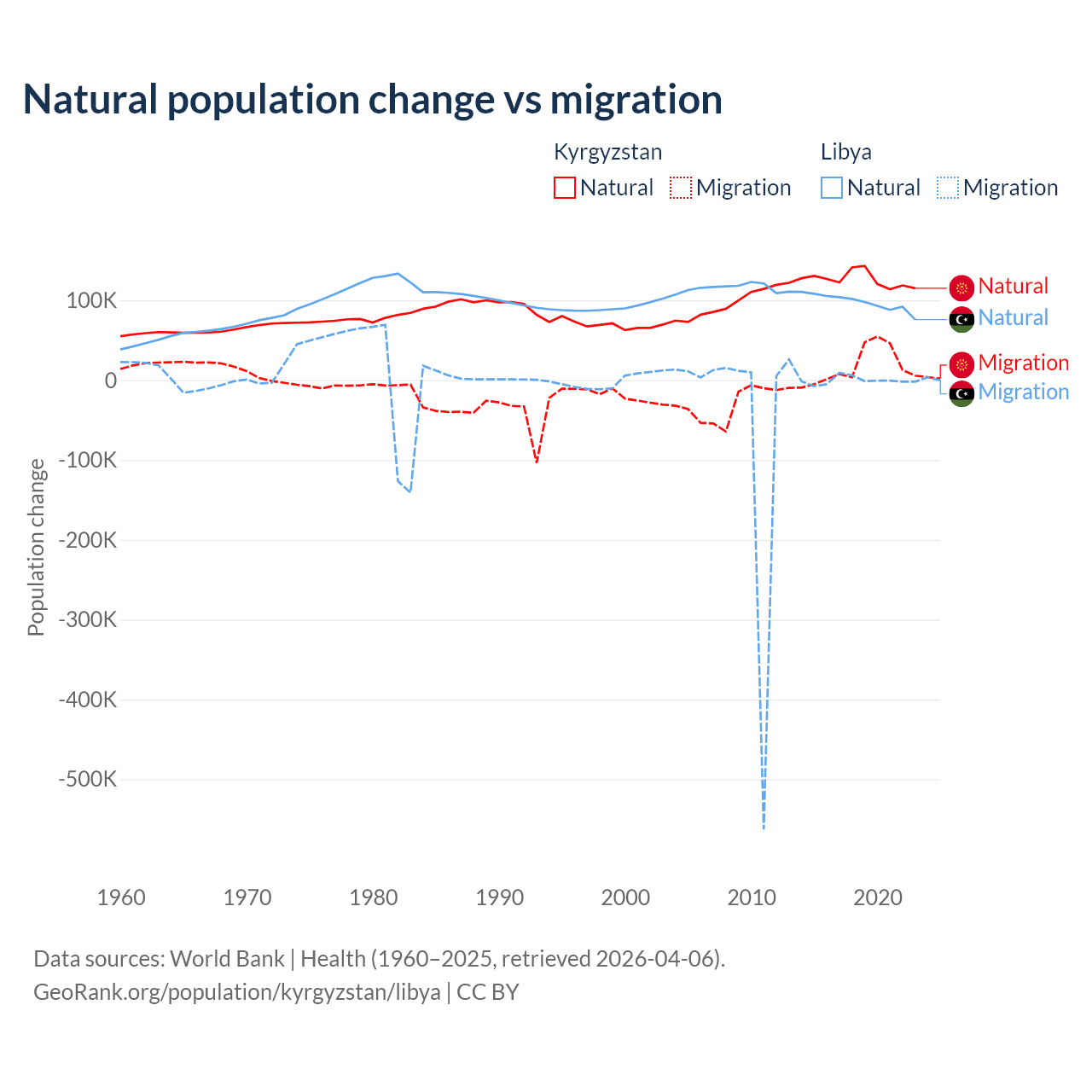 Over the last 10 years, 88.5% of the population change in Kyrgyzstan is from natural causes (a gain of 1,258,837 people) and 11.5% is from migration (a gain of 164,132 people). In Libya 99.4% is from natural causes (a gain of 975,799 people) and 0.63% is from migration (a loss of 6,150 people).