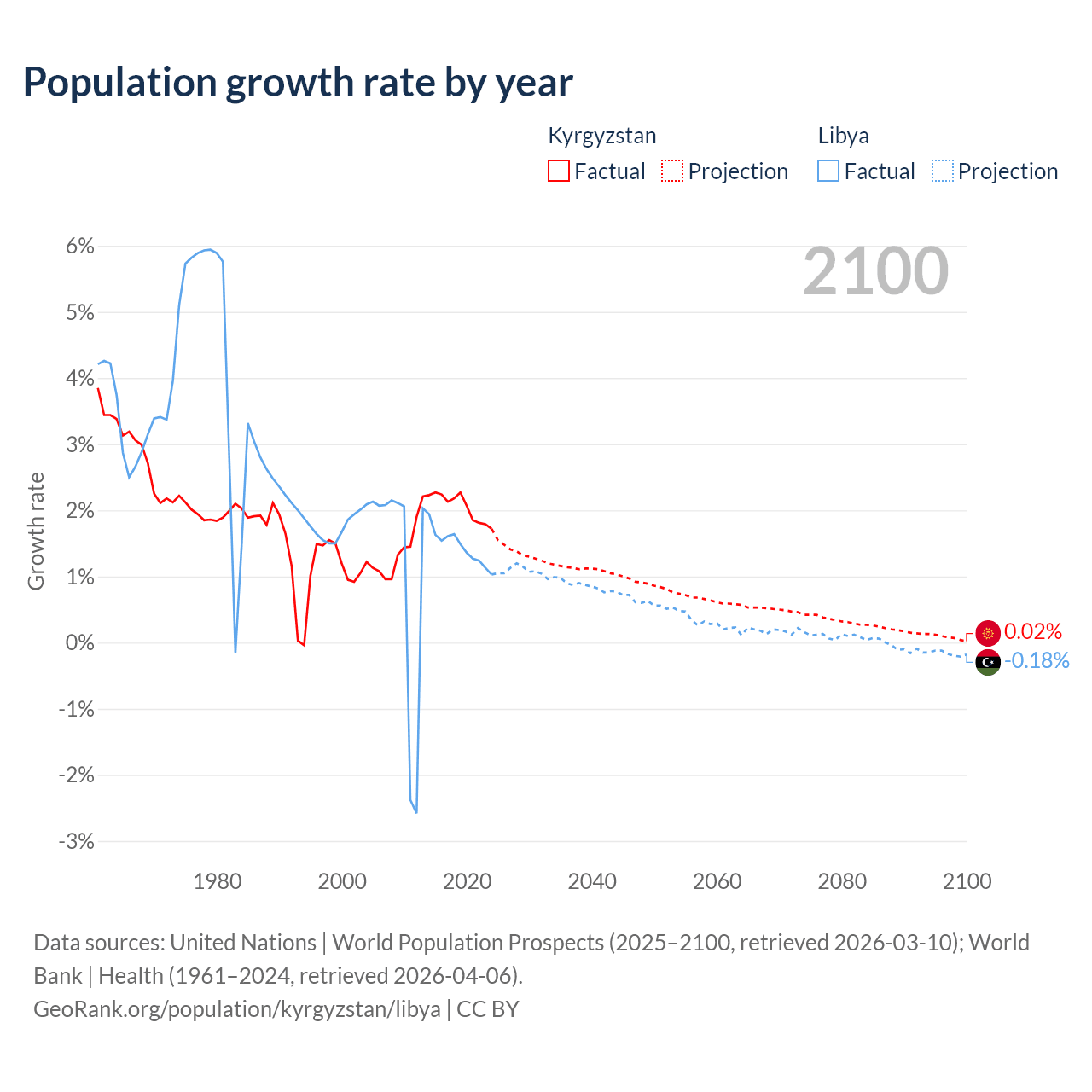 - For the last 10 years, Kyrgyzstan has had an average growth rate of +2.05% per year vs +1.44% in Libya.