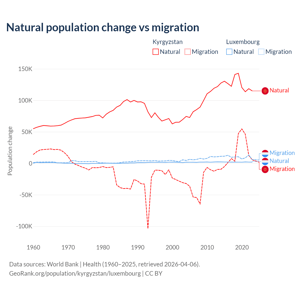 Over the last 10 years, 88.5% of the population change in Kyrgyzstan is from natural causes (a gain of 1,258,837 people) and 11.5% is from migration (a gain of 164,132 people). In Luxembourg 16.8% is from natural causes (a gain of 20,287 people) and 83.2% is from migration (a gain of 100,435 people).