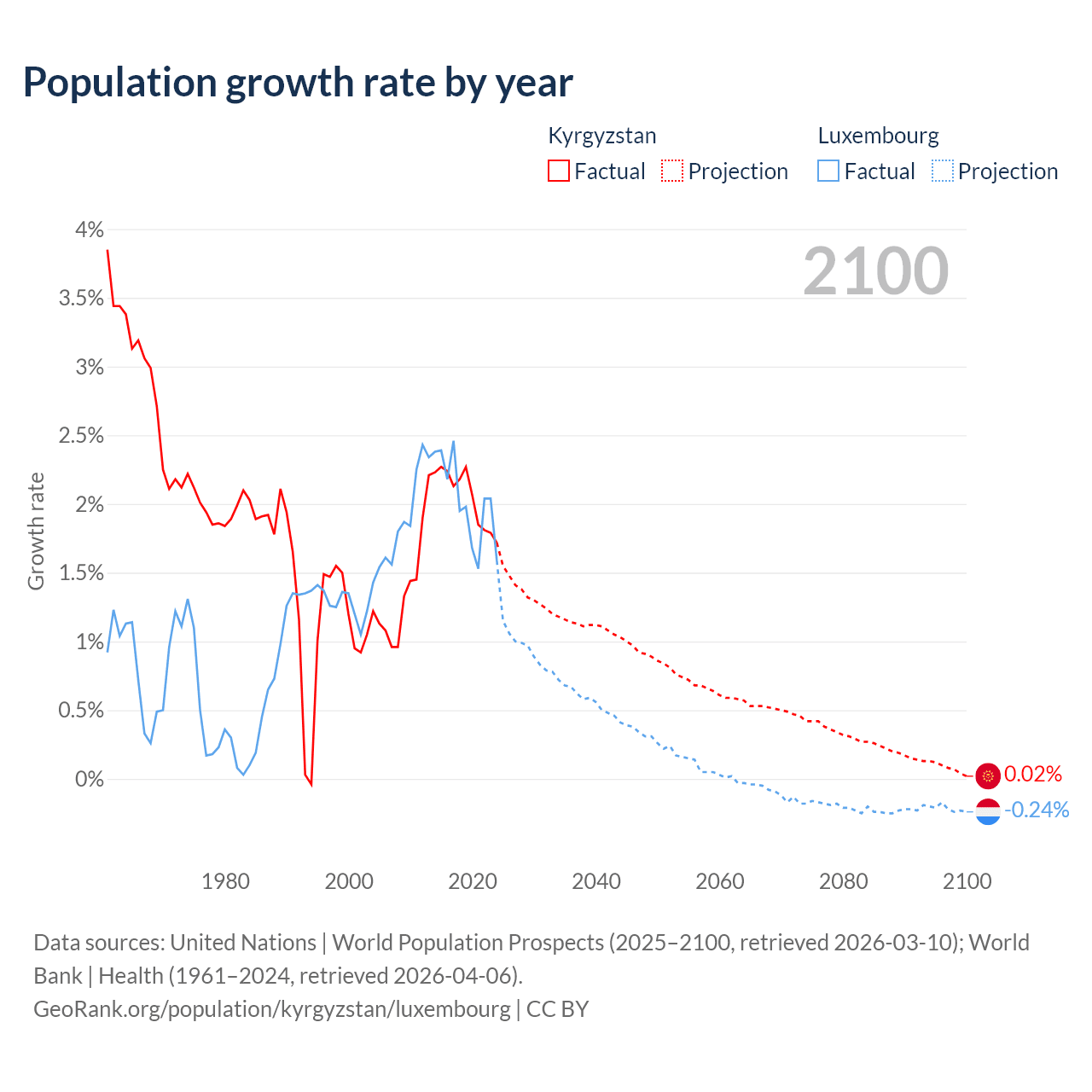 - For the last 10 years, Kyrgyzstan has had an average growth rate of +2.05% per year vs +2.02% in Luxembourg.