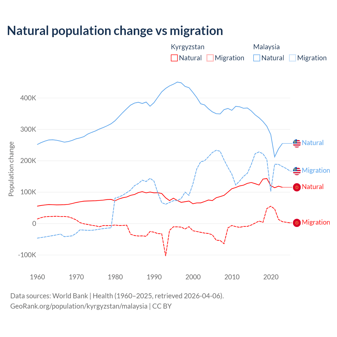 Over the last 10 years, 88.5% of the population change in Kyrgyzstan is from natural causes (a gain of 1,258,837 people) and 11.5% is from migration (a gain of 164,132 people). In Malaysia 61.7% is from natural causes (a gain of 3,029,648 people) and 38.3% is from migration (a gain of 1,882,159 people).