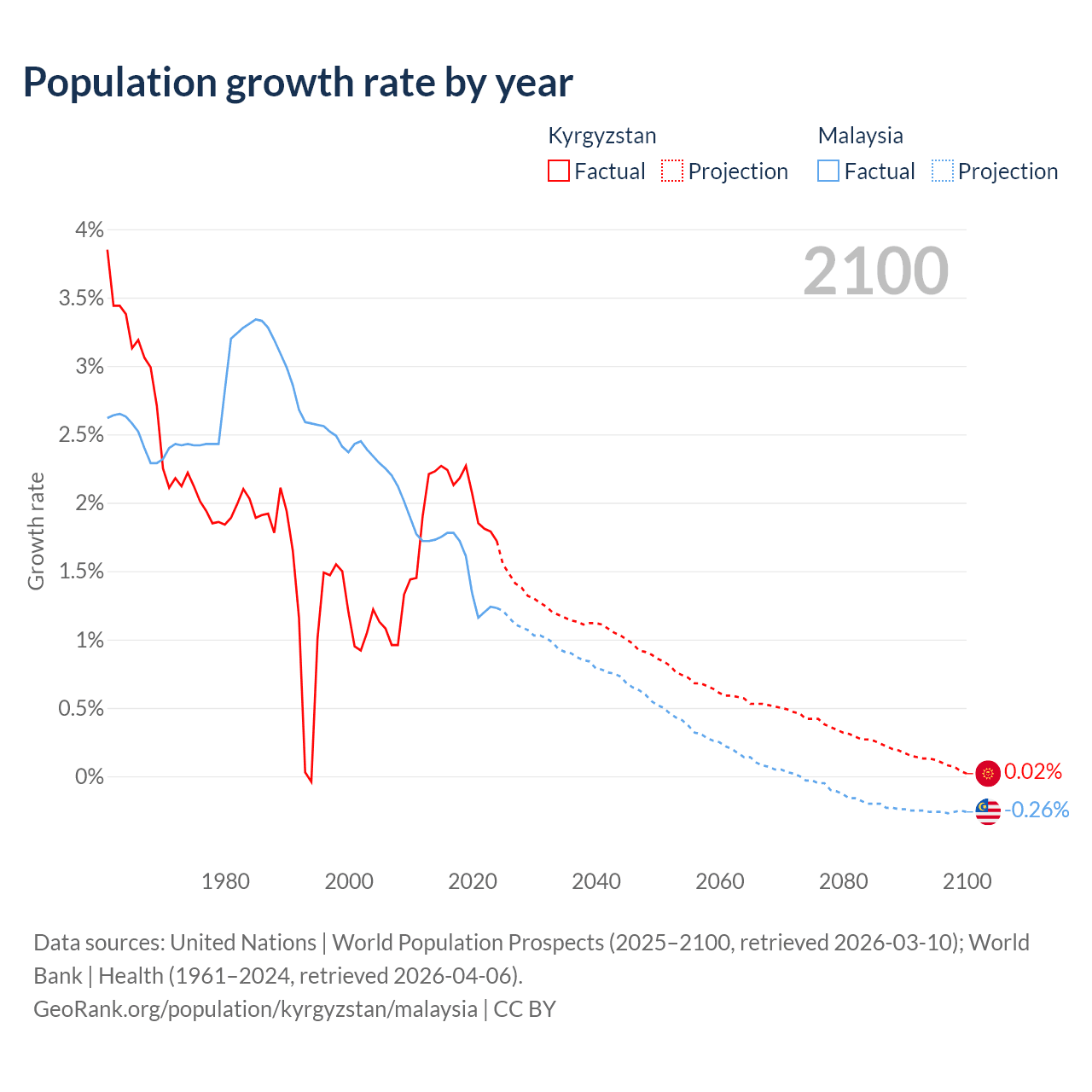 - For the last 10 years, Kyrgyzstan has had an average growth rate of +2.05% per year vs +1.5% in Malaysia.