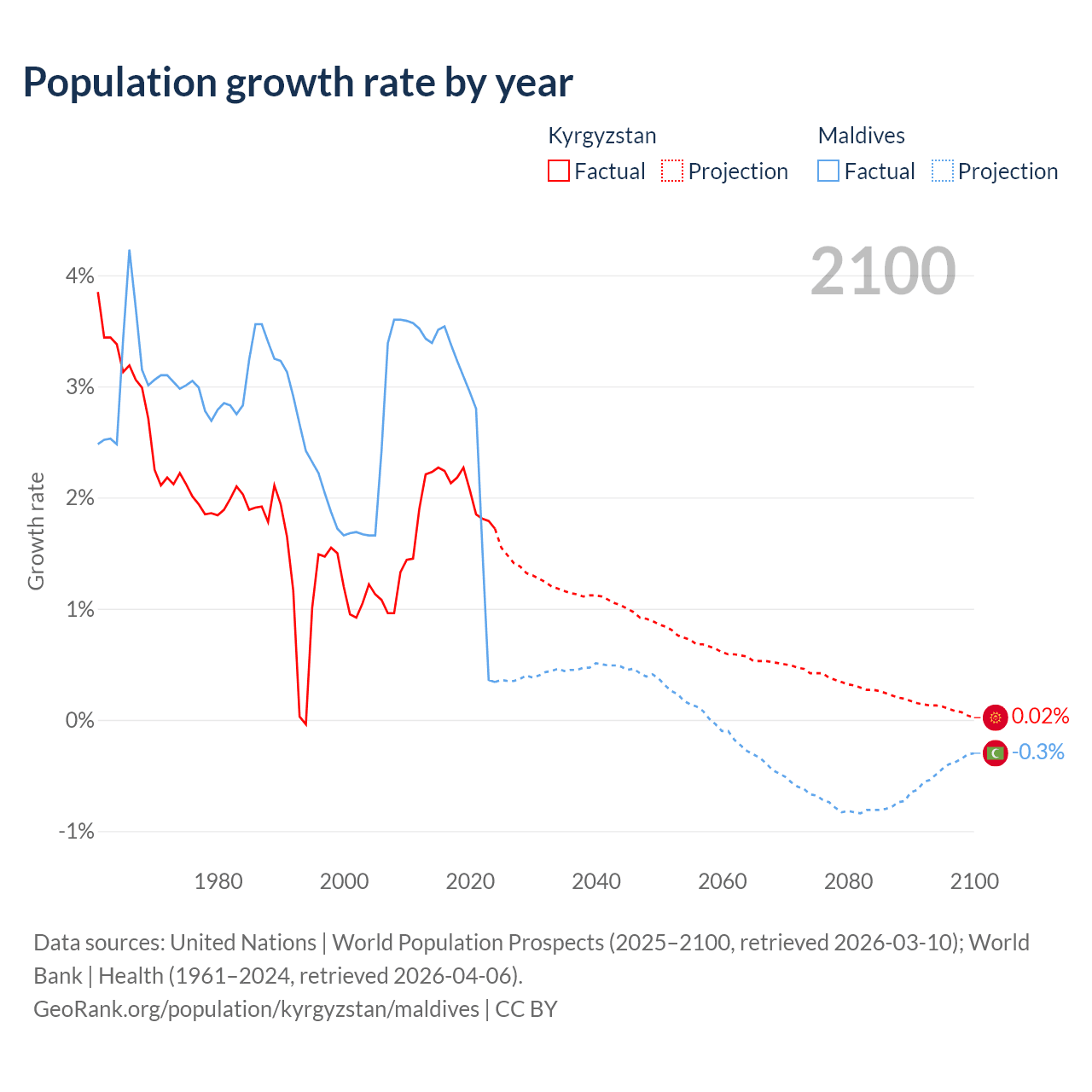 - For the last 10 years, Kyrgyzstan has had an average growth rate of +2.05% per year vs +2.56% in Maldives.