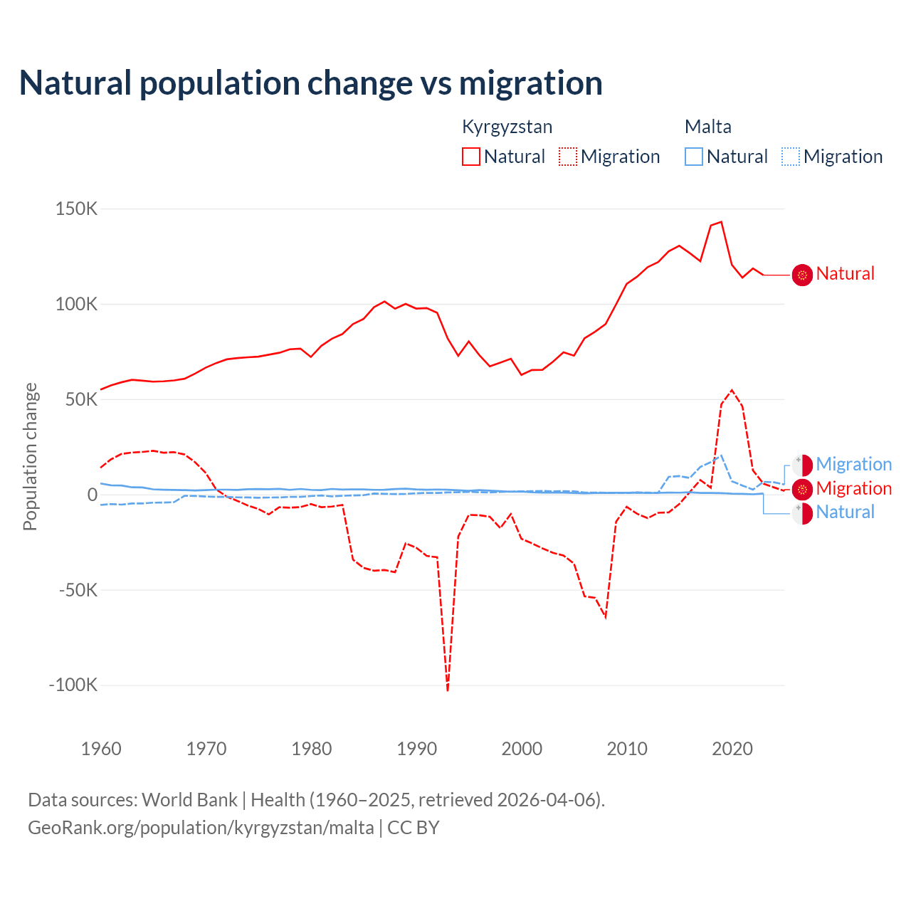 Over the last 10 years, 88.5% of the population change in Kyrgyzstan is from natural causes (a gain of 1,258,837 people) and 11.5% is from migration (a gain of 164,132 people). In Malta 5.84% is from natural causes (a gain of 6,181 people) and 94.2% is from migration (a gain of 99,652 people).