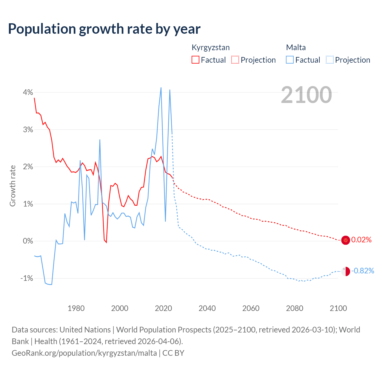 - For the last 10 years, Kyrgyzstan has had an average growth rate of +2.05% per year vs +2.69% in Malta.
