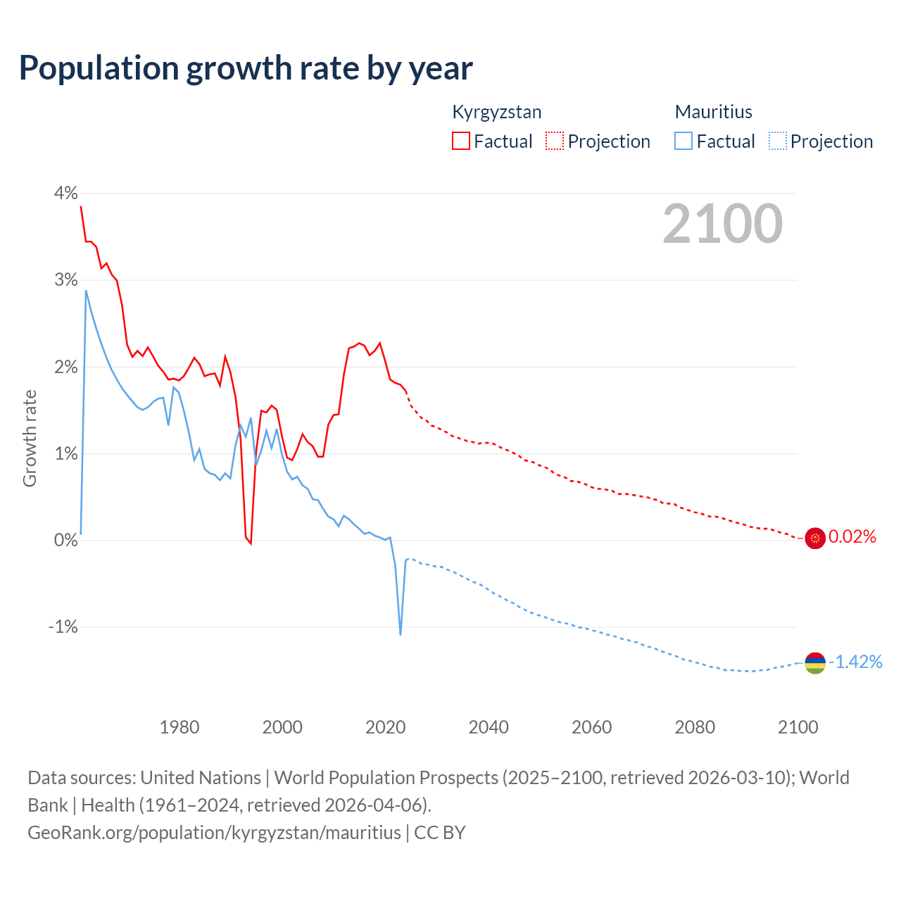 - For the last 10 years, Kyrgyzstan has had an average growth rate of +2.05% per year vs -0.09% in Mauritius.