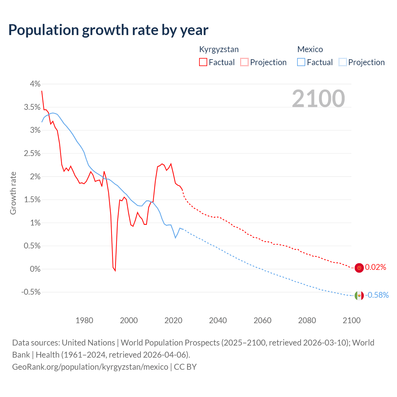 - For the last 10 years, Kyrgyzstan has had an average growth rate of +2.05% per year vs +0.92% in Mexico.